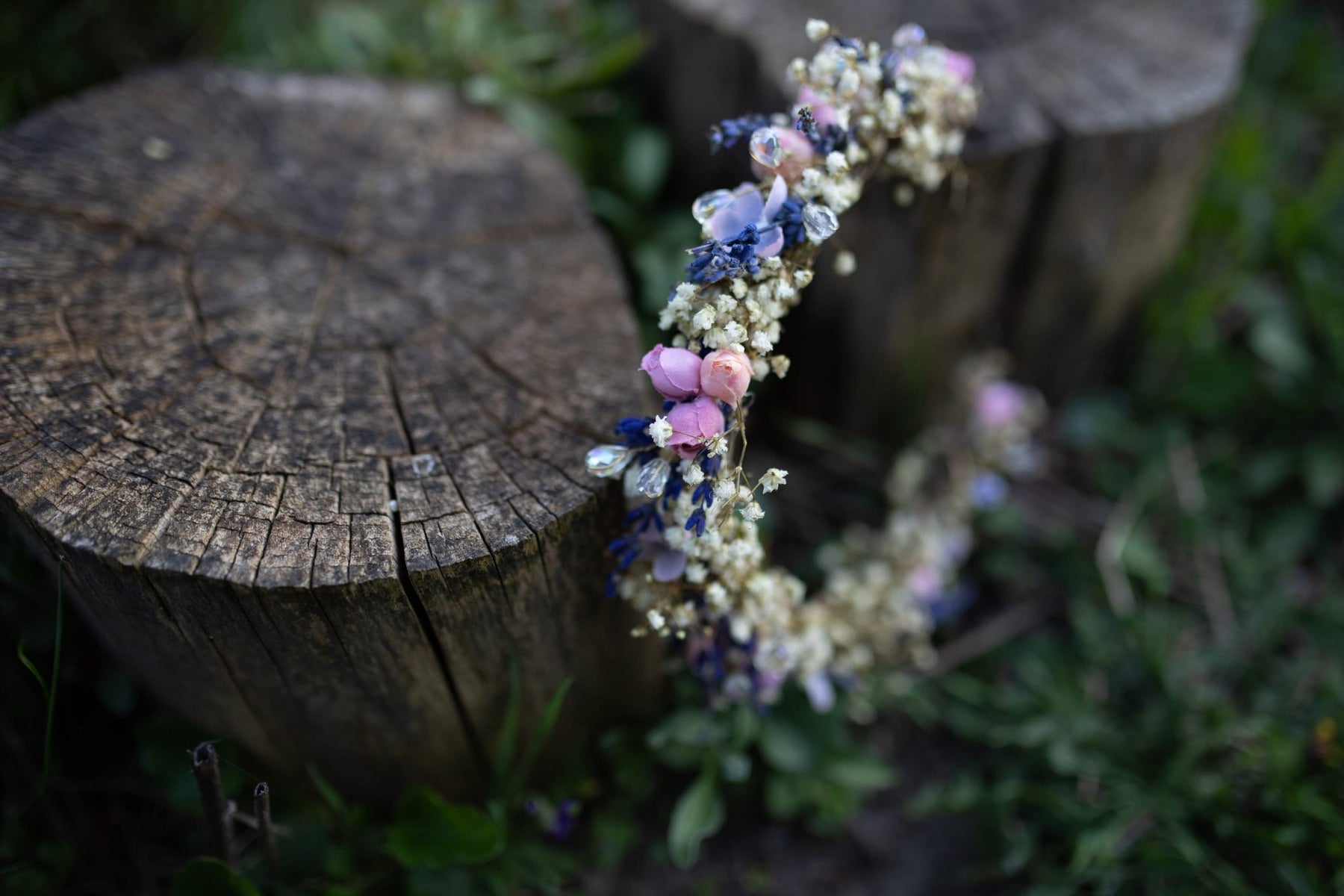The half wreath is made of artificial flowers, baby's breath, lavenders, crystals, wire, floristic tape and other trinkets used for arranging.