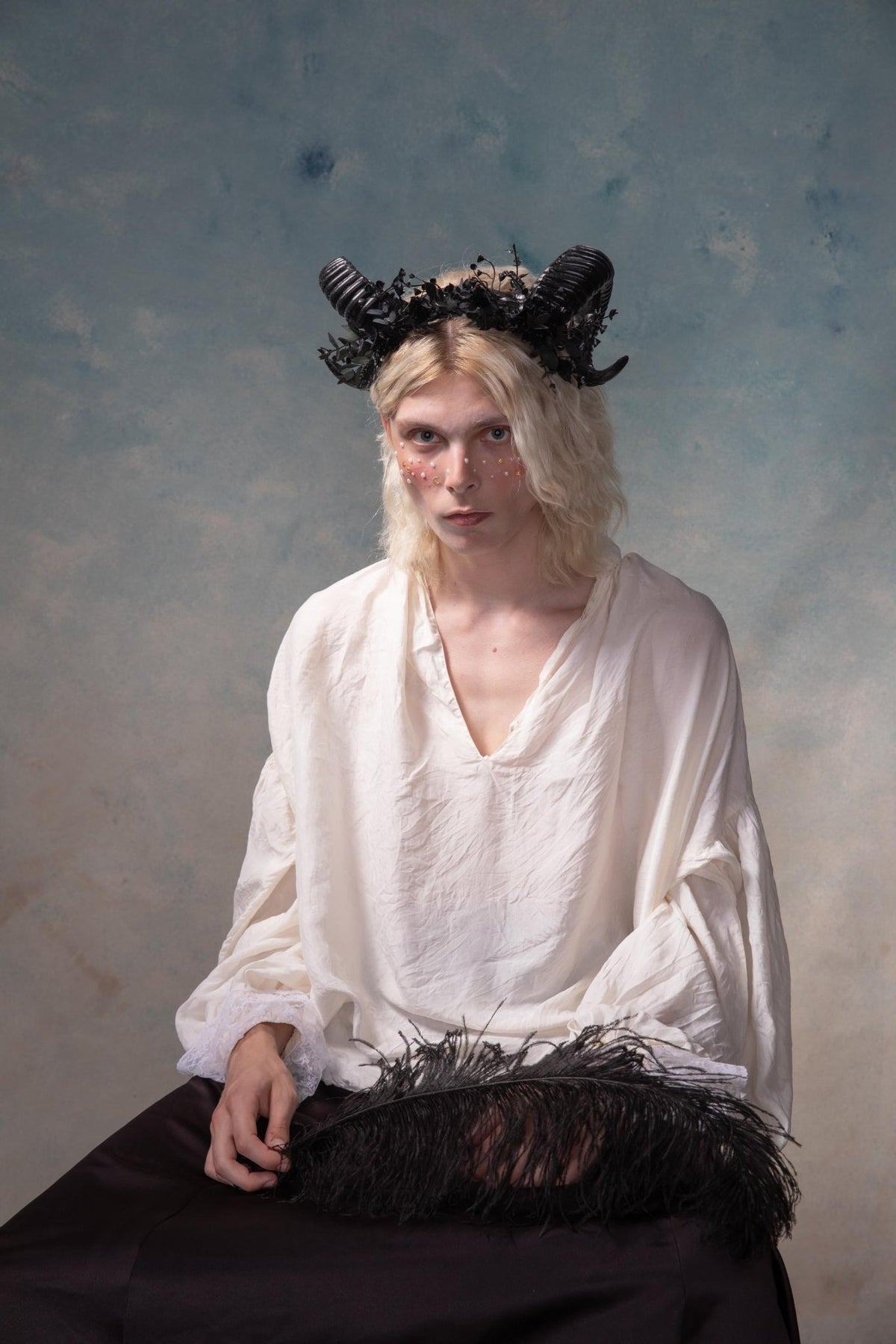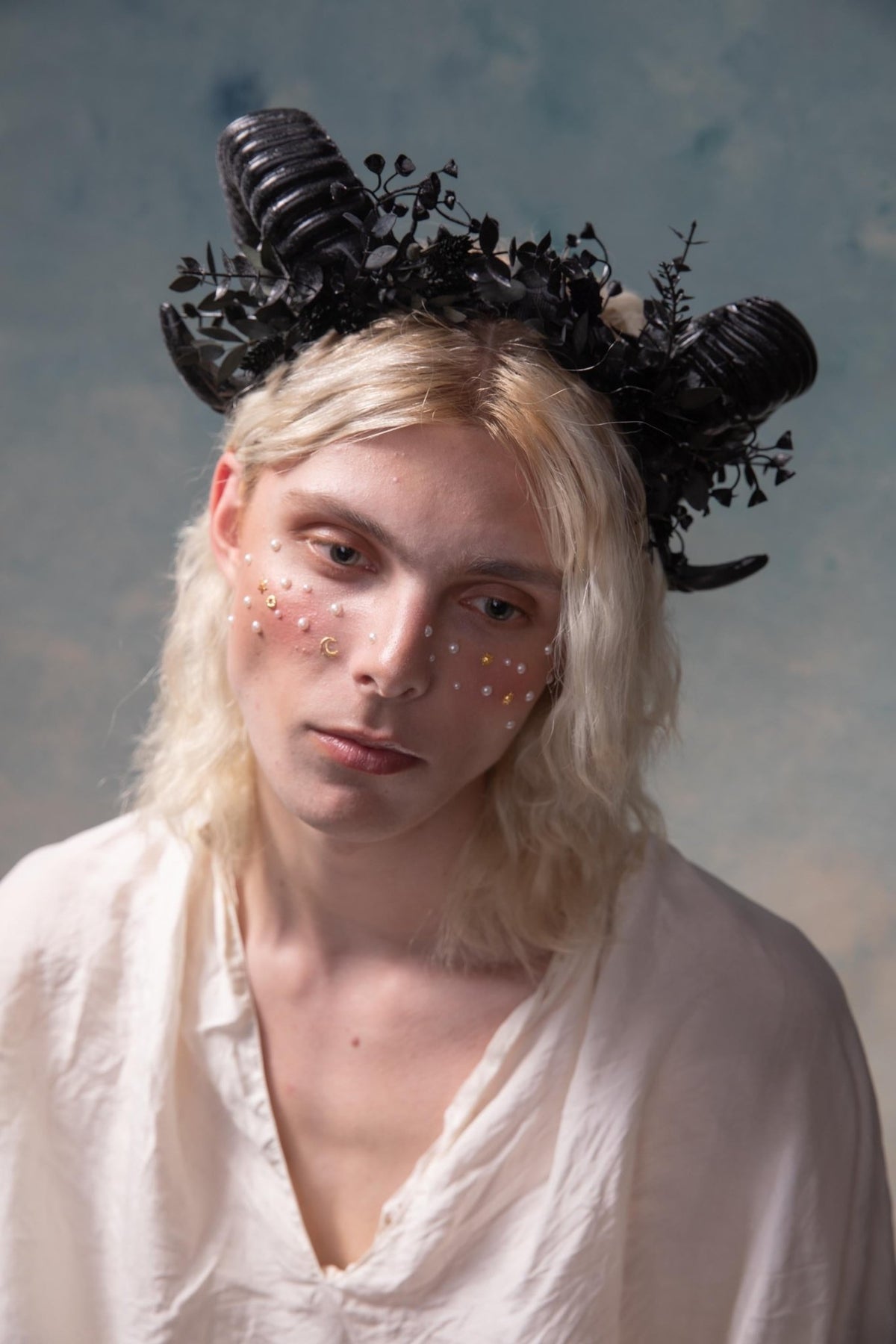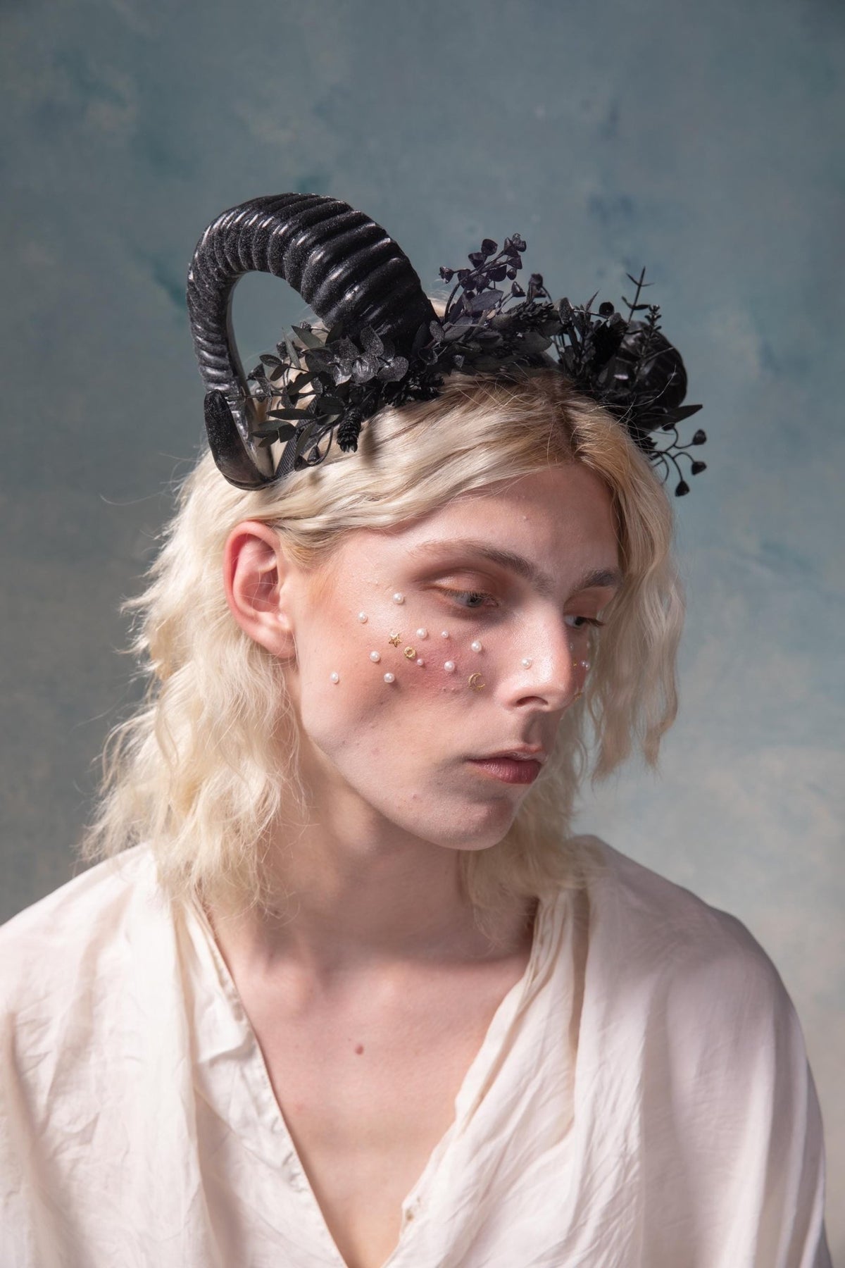 The flower crown is made of artificial, leaves, grass, horns and other trinkets used for arranging.
