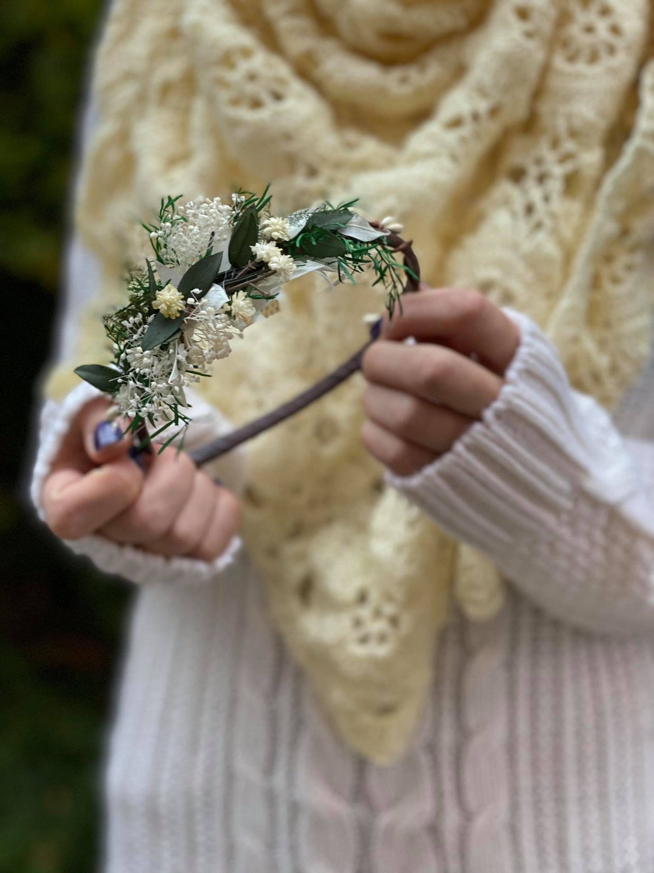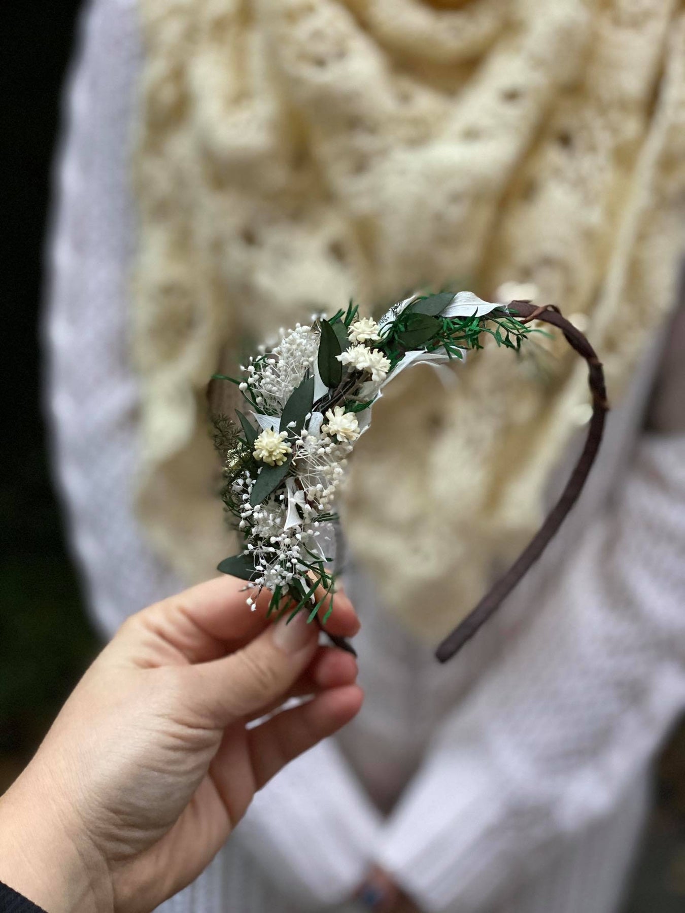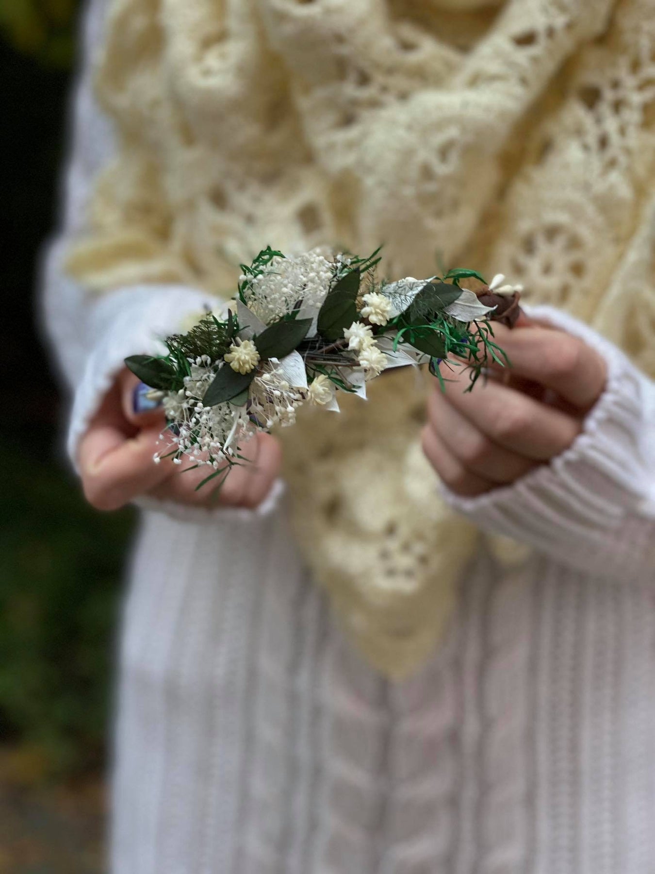 This headband feels like a gentle touch of winter – eucalyptus and soft green grasses create a fresh natural base, while tiny white gypsophila resembles small snowflakes. It feels clean, soft and fresh – like a winter morning when the world wakes up to the silence of a festive winter atmosphere. The headband's decor is on one side, the base is soft, comfortable to wear, and does not press even when worn for a long time. Suitable for children and adults. A beautiful accessory for a winter wedding.