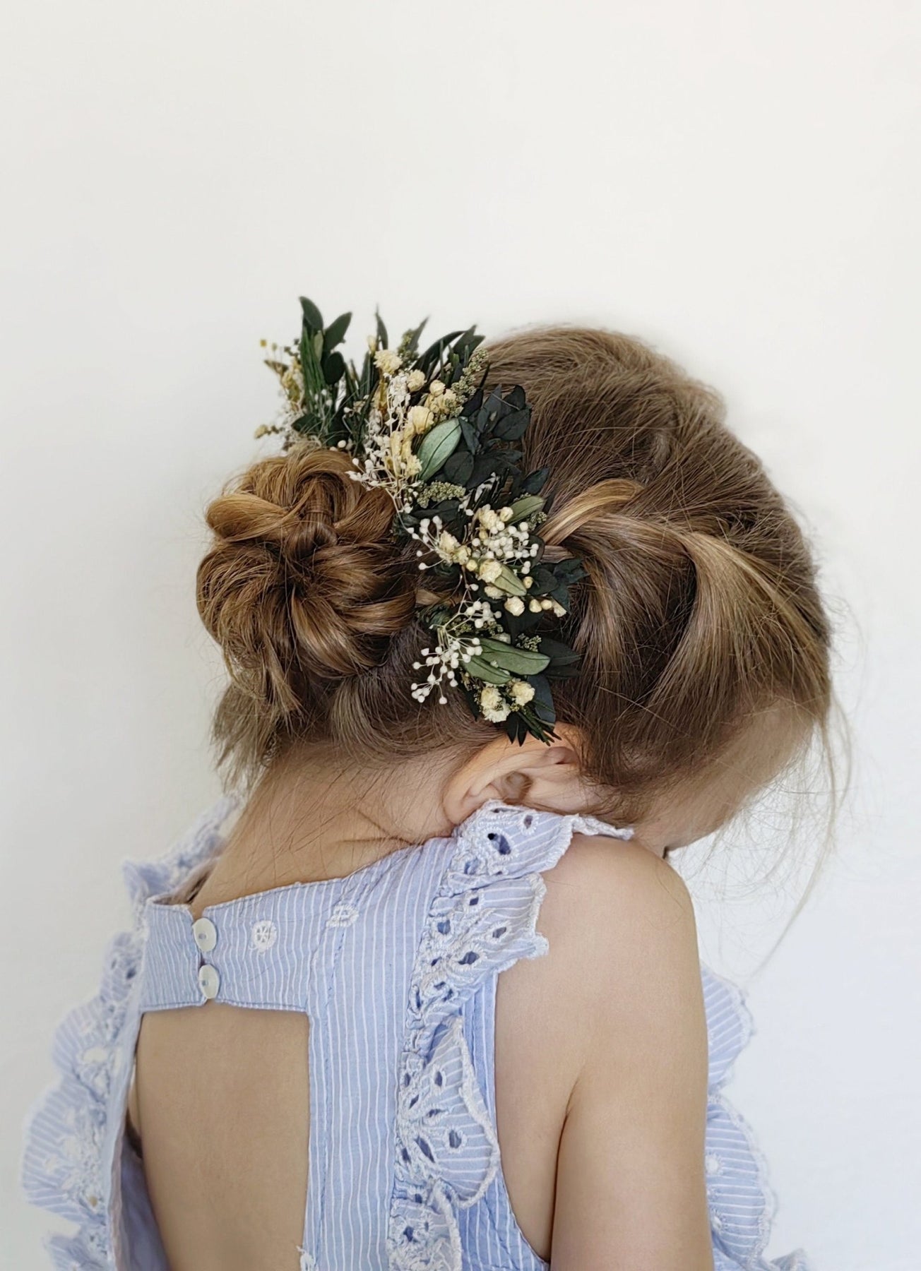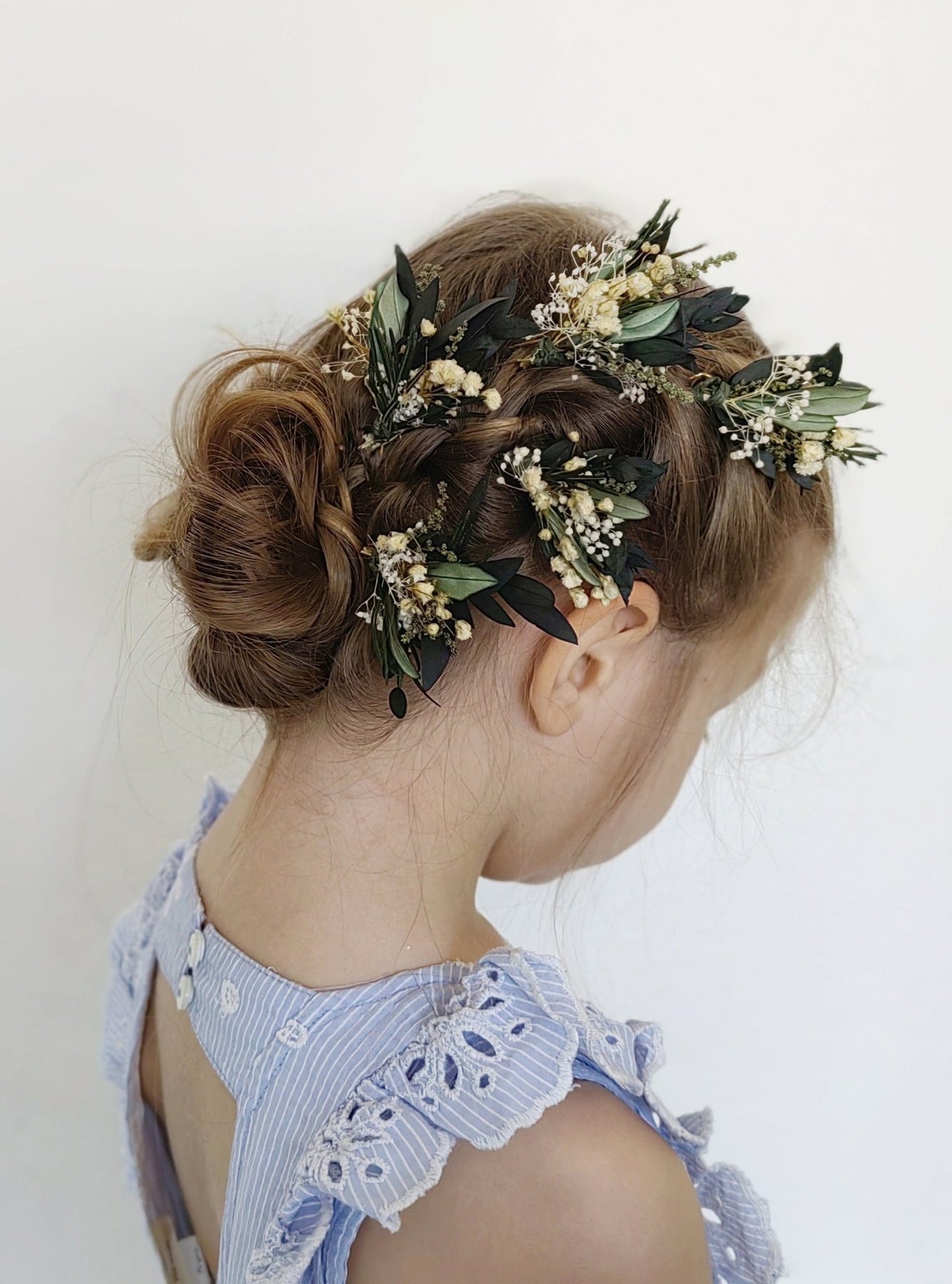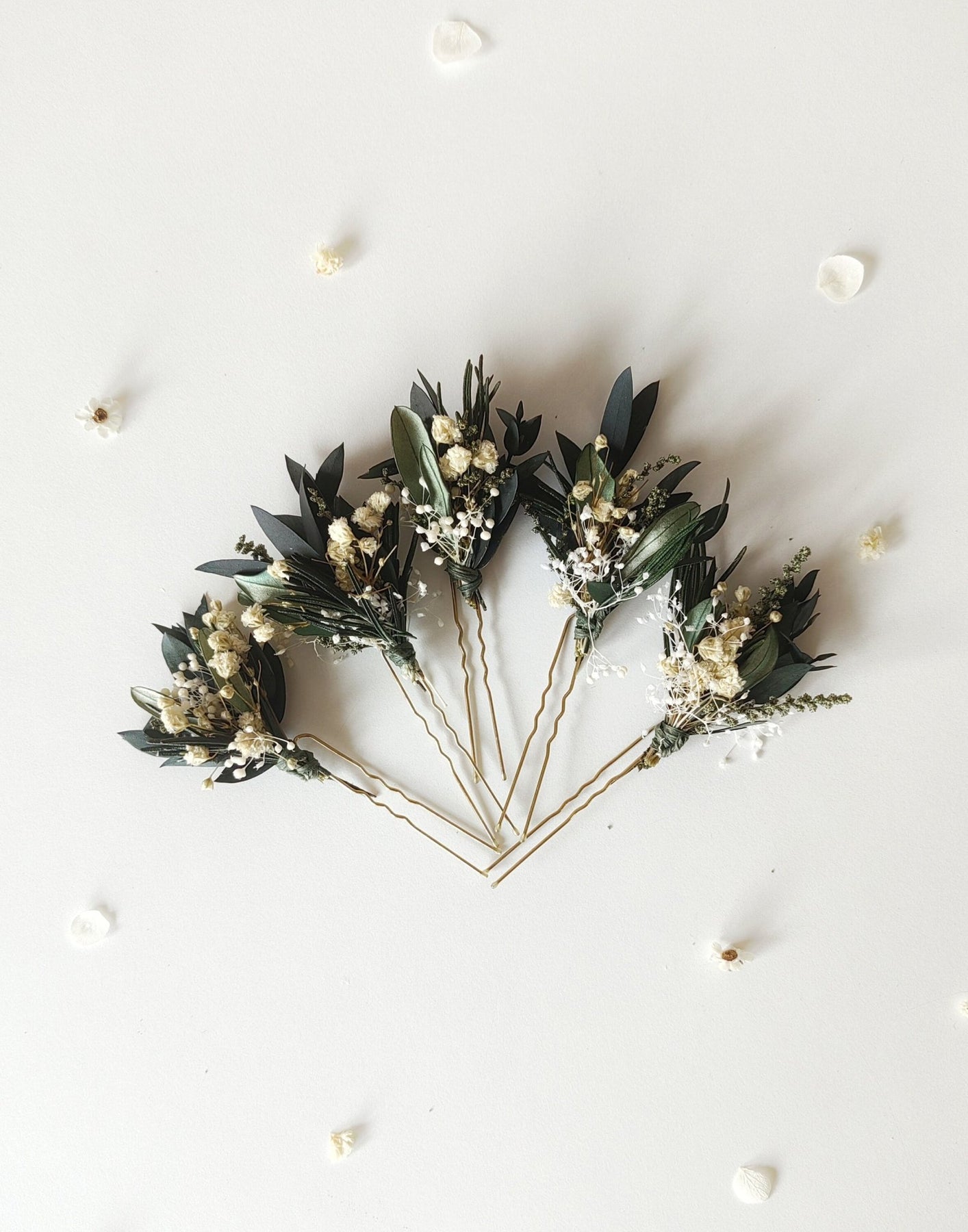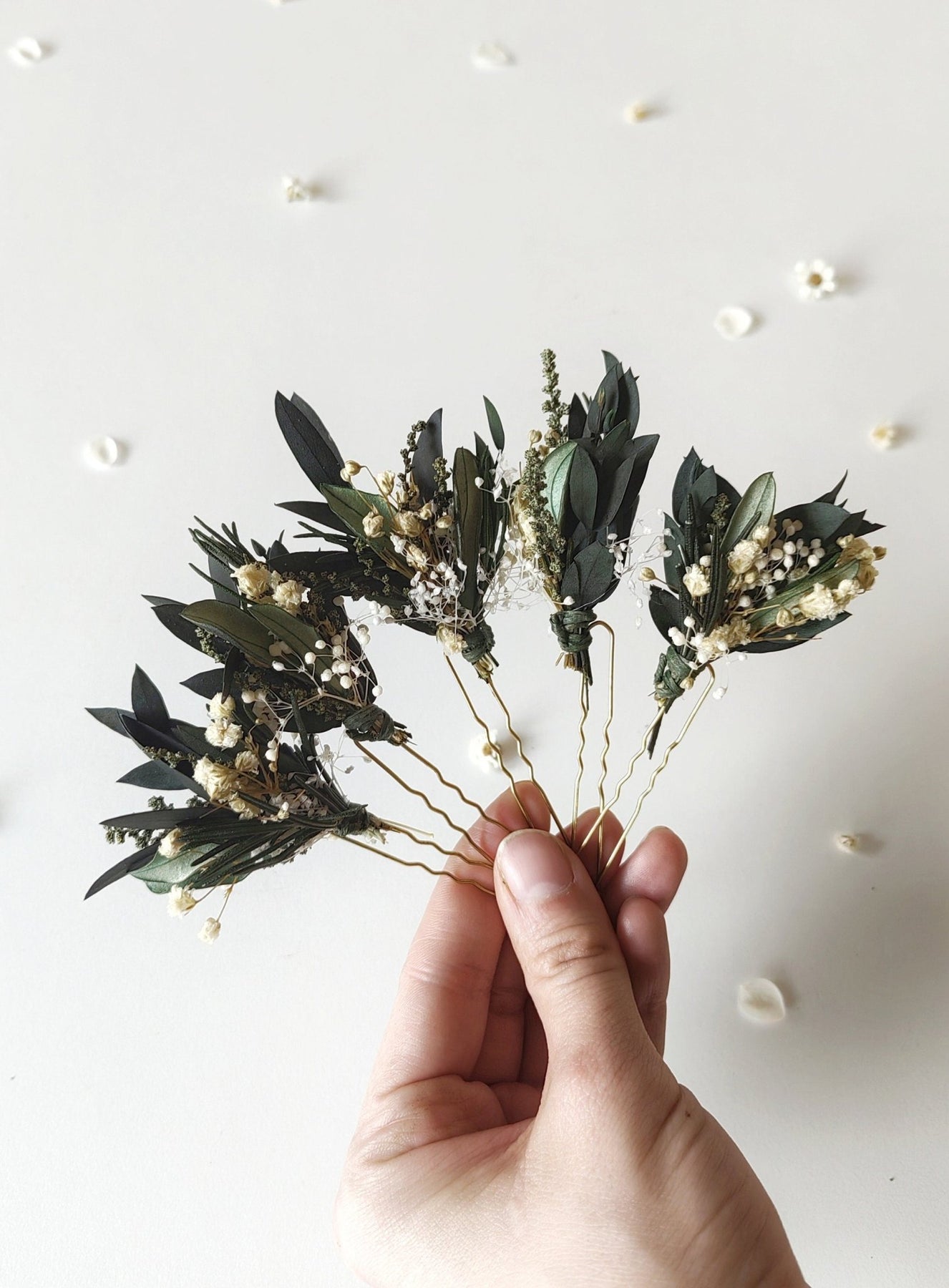 The flower hair pins are made of preserved eucalyptus and olive leaves, baby's breath, rosemary and floristic tape.