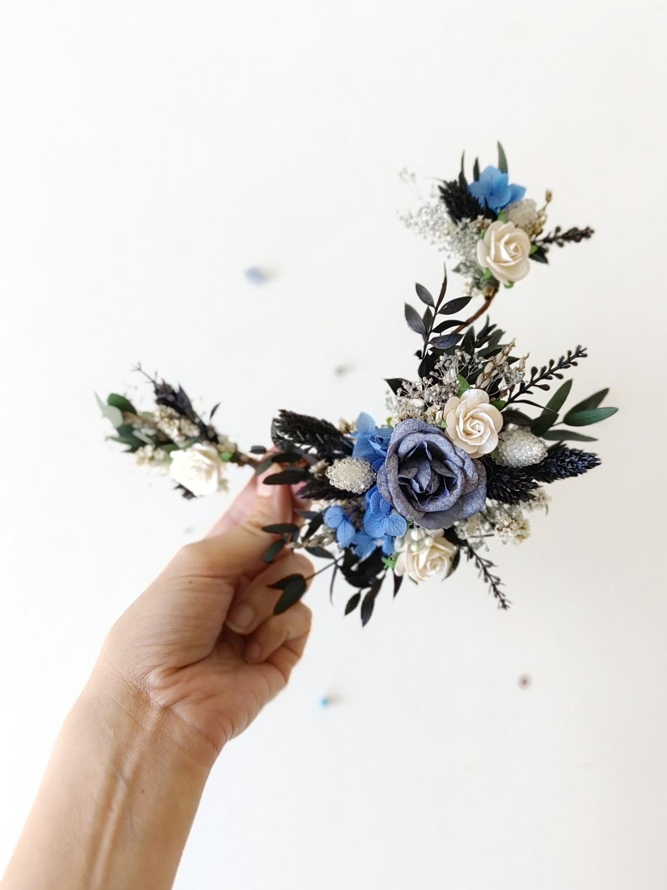 Handmade hair comb or hair vine. It´s bendable/shapeable to perfectly fit your hairstyle! :) Suitable for gothic, winter or autumn wedding . Blue and white combination...You can also wear it as a hat decoration