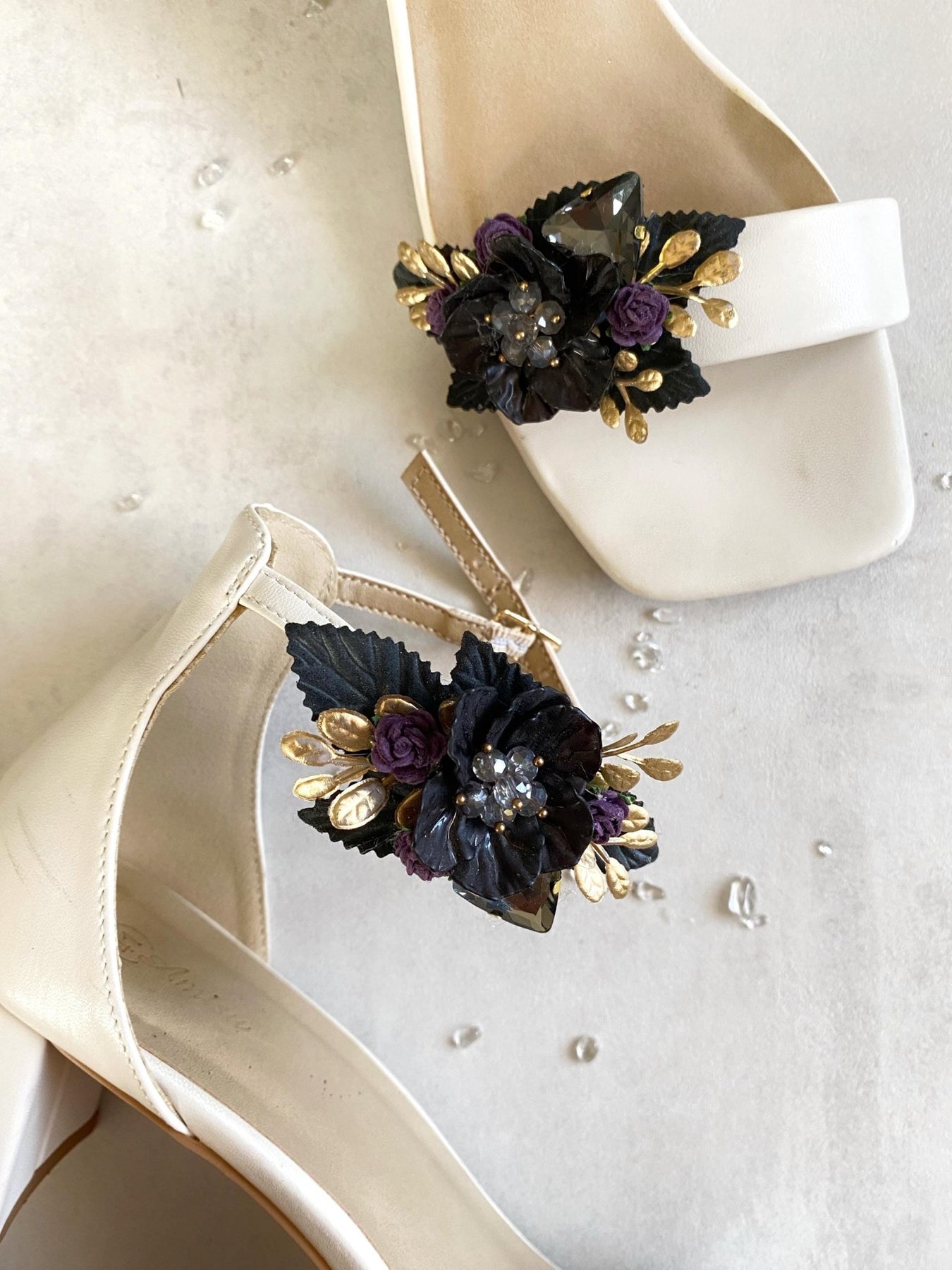 Black Purple & Gold Flower Shoe Clips: Gothic Glam Bridal Jewelry