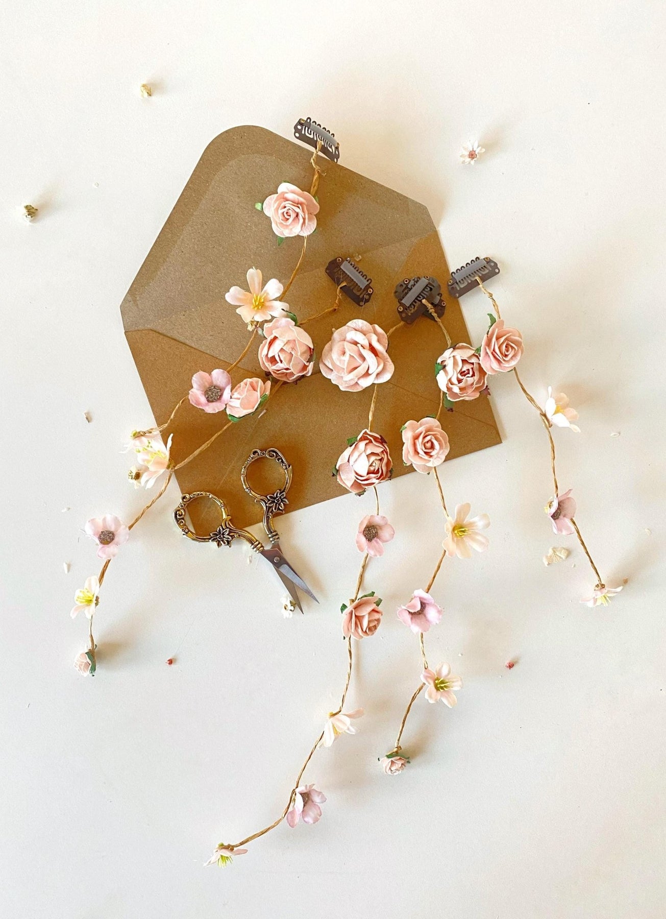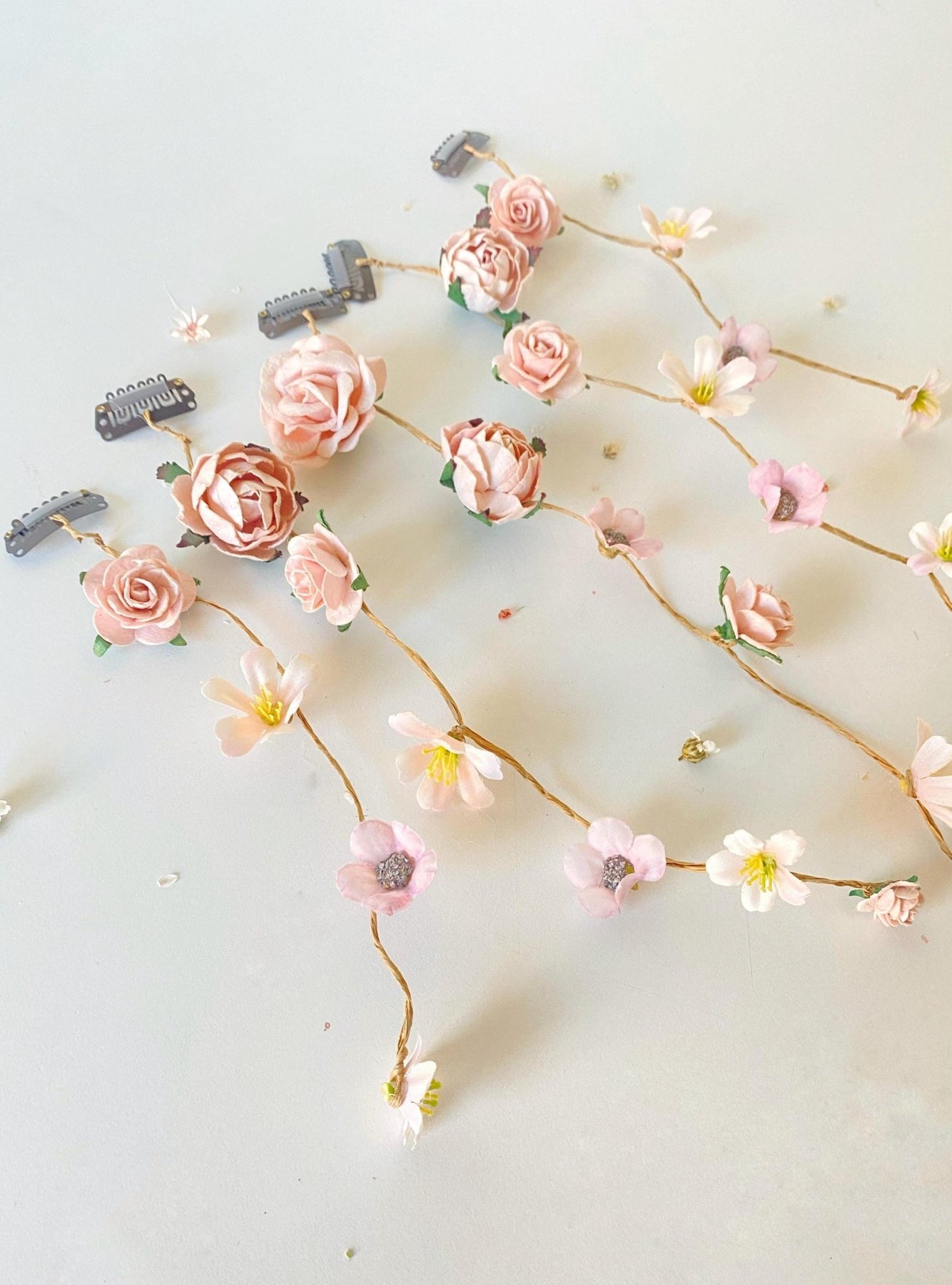 Boho Bridal Hair Vine: Pale Pink Flower Veil, Cottagecore Wedding – handmade floral hair accessory by magaela