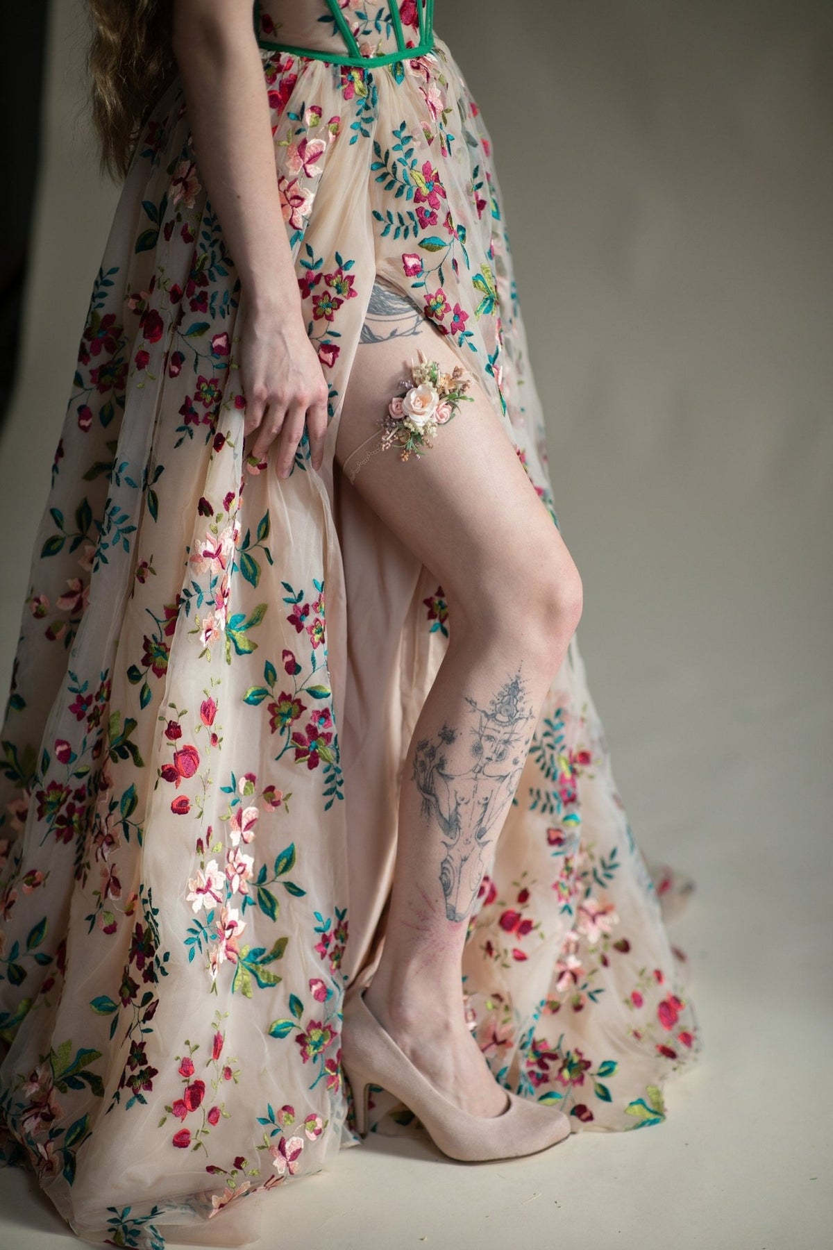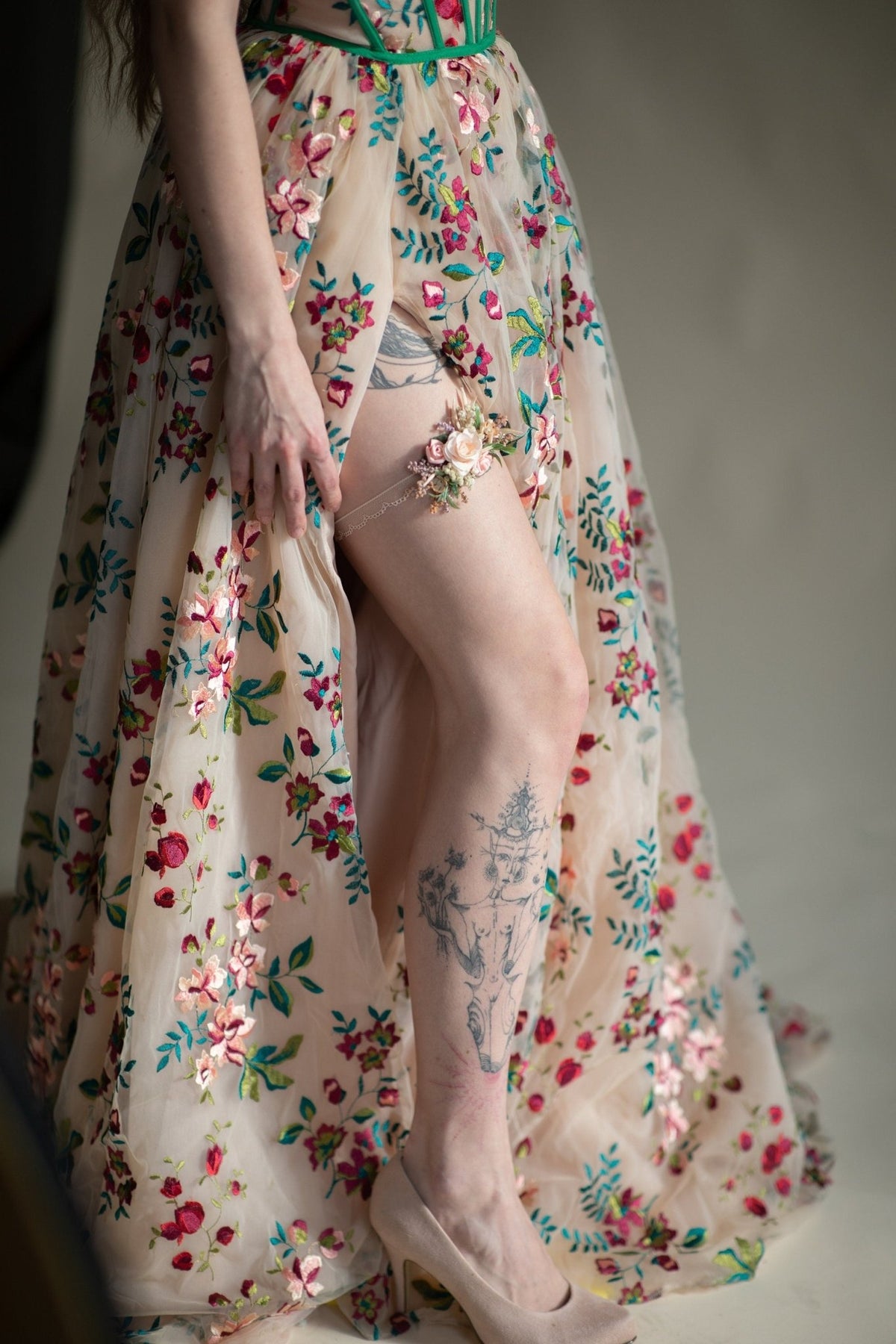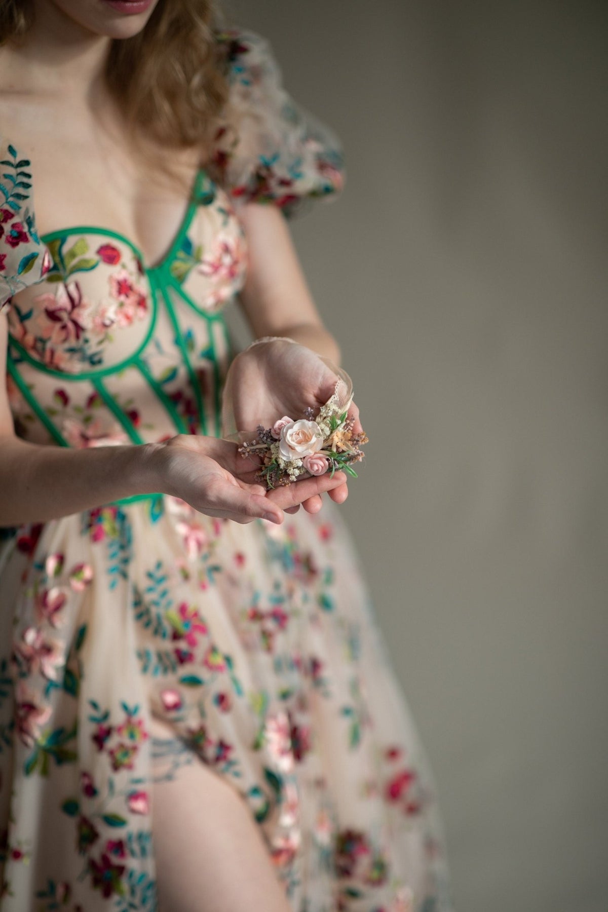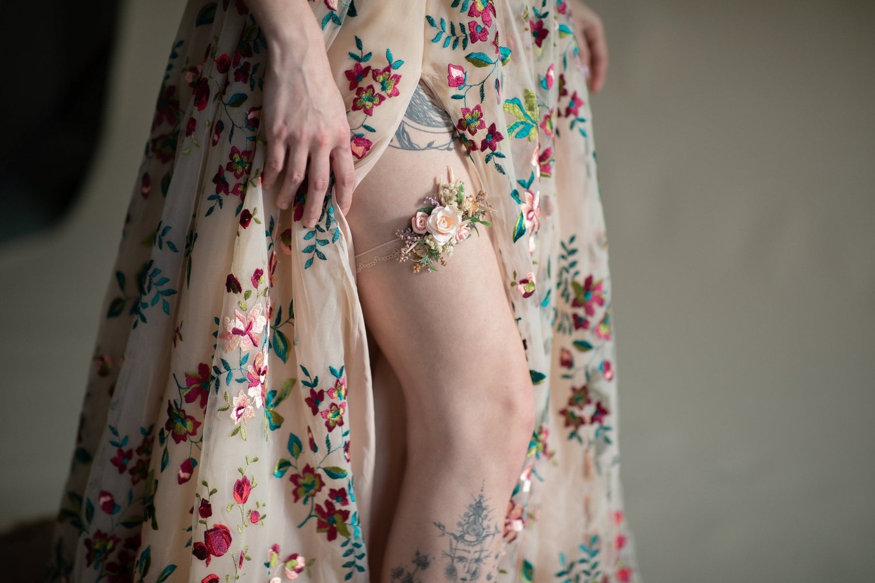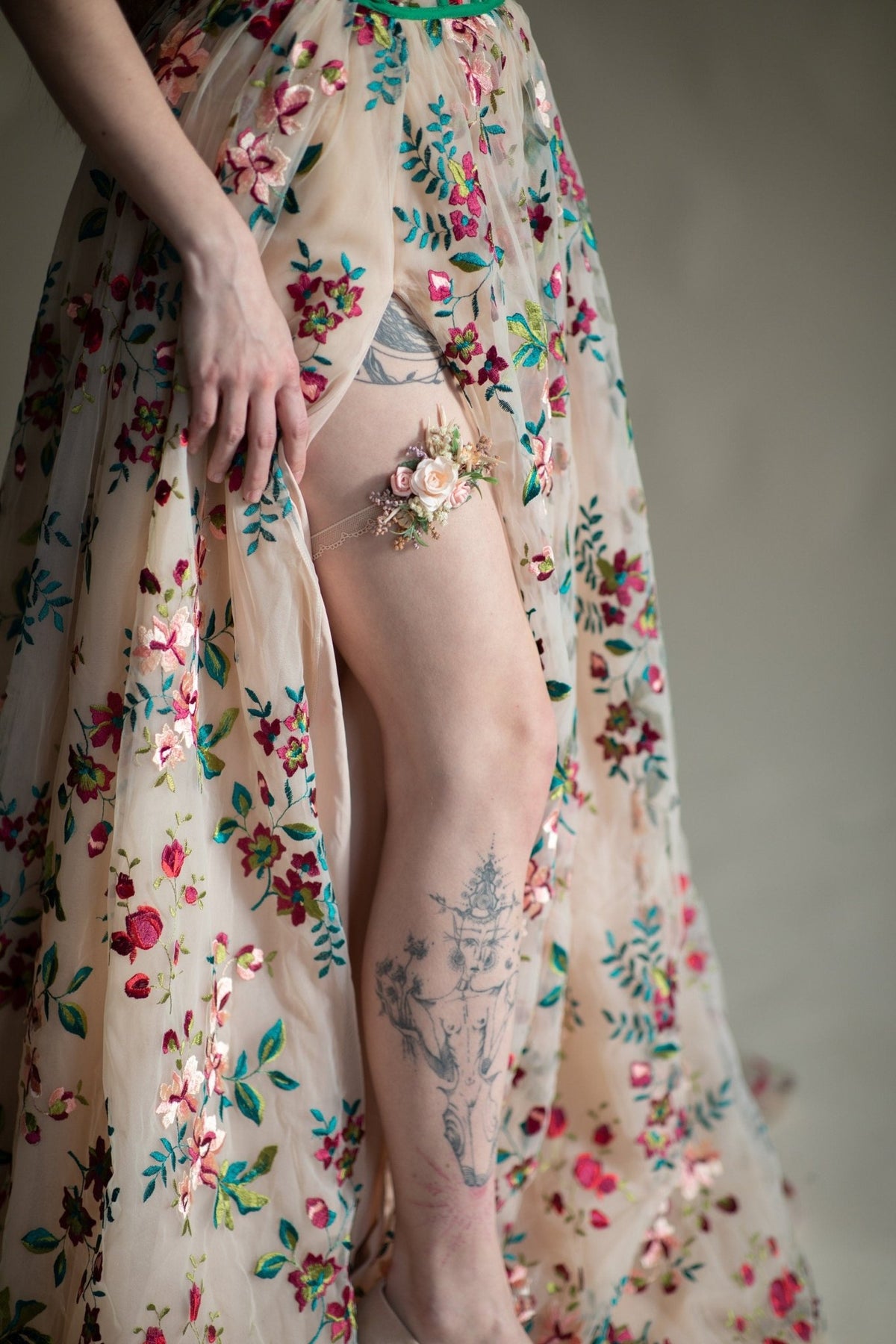 The garter is made of preserved and artificial flowers, lace and other trinkets used for arranging :)