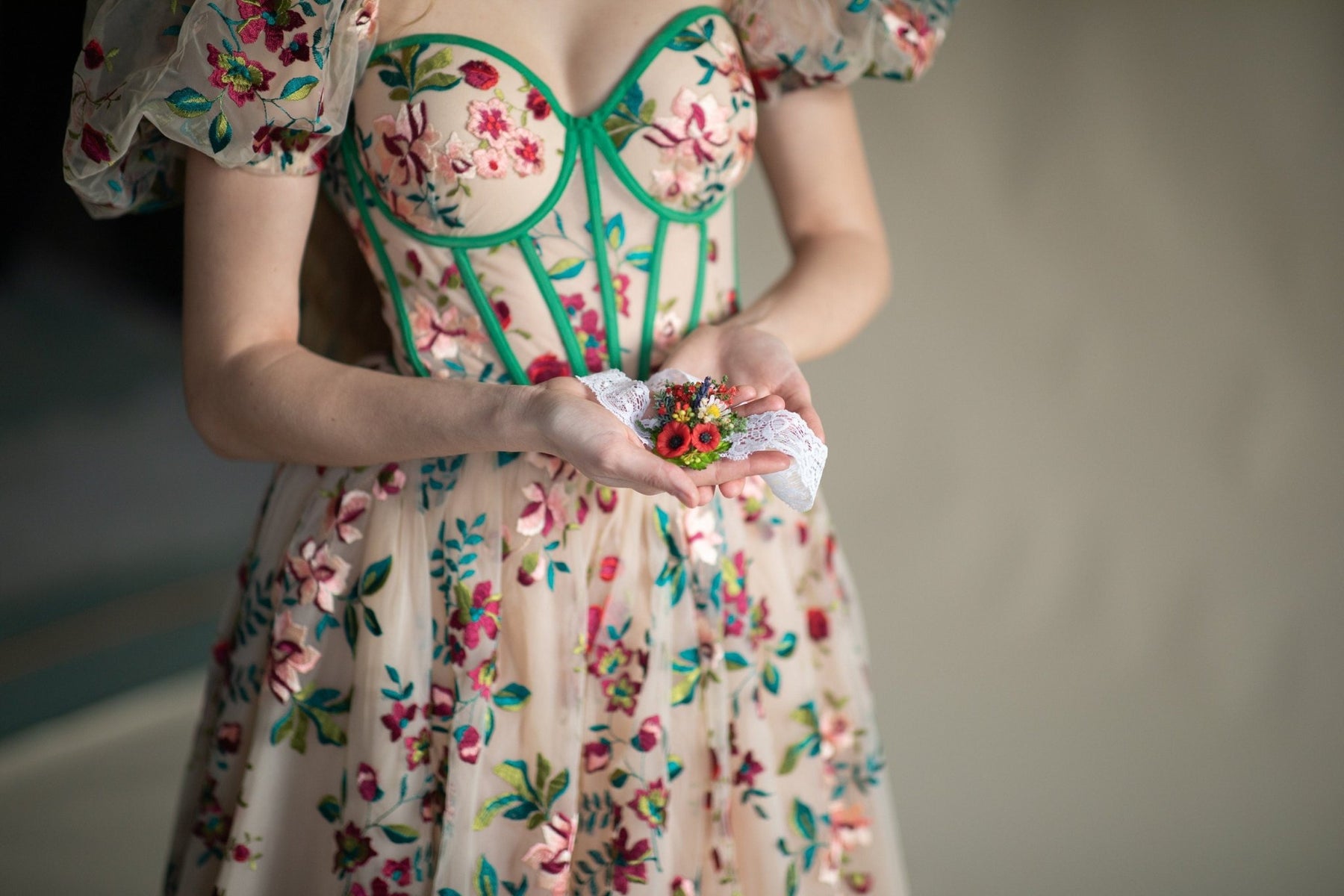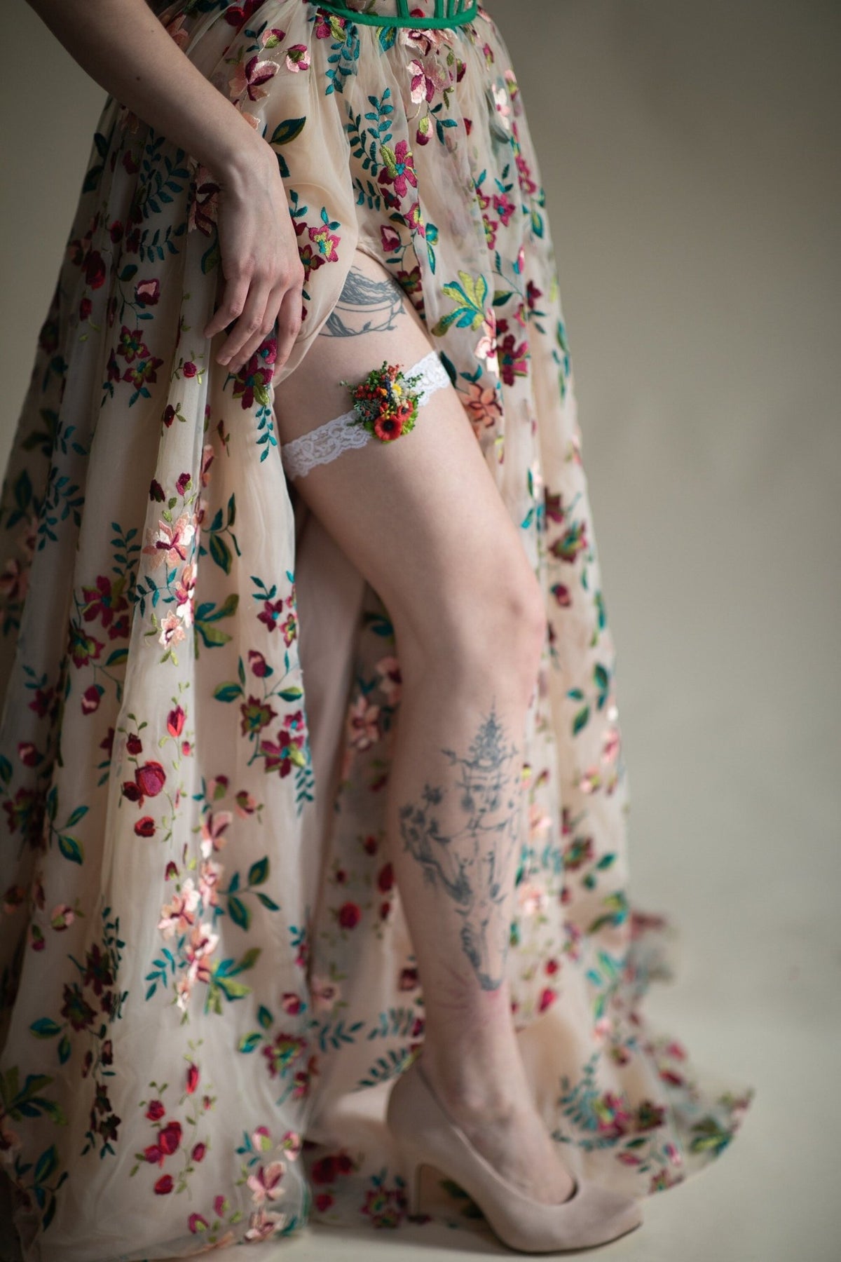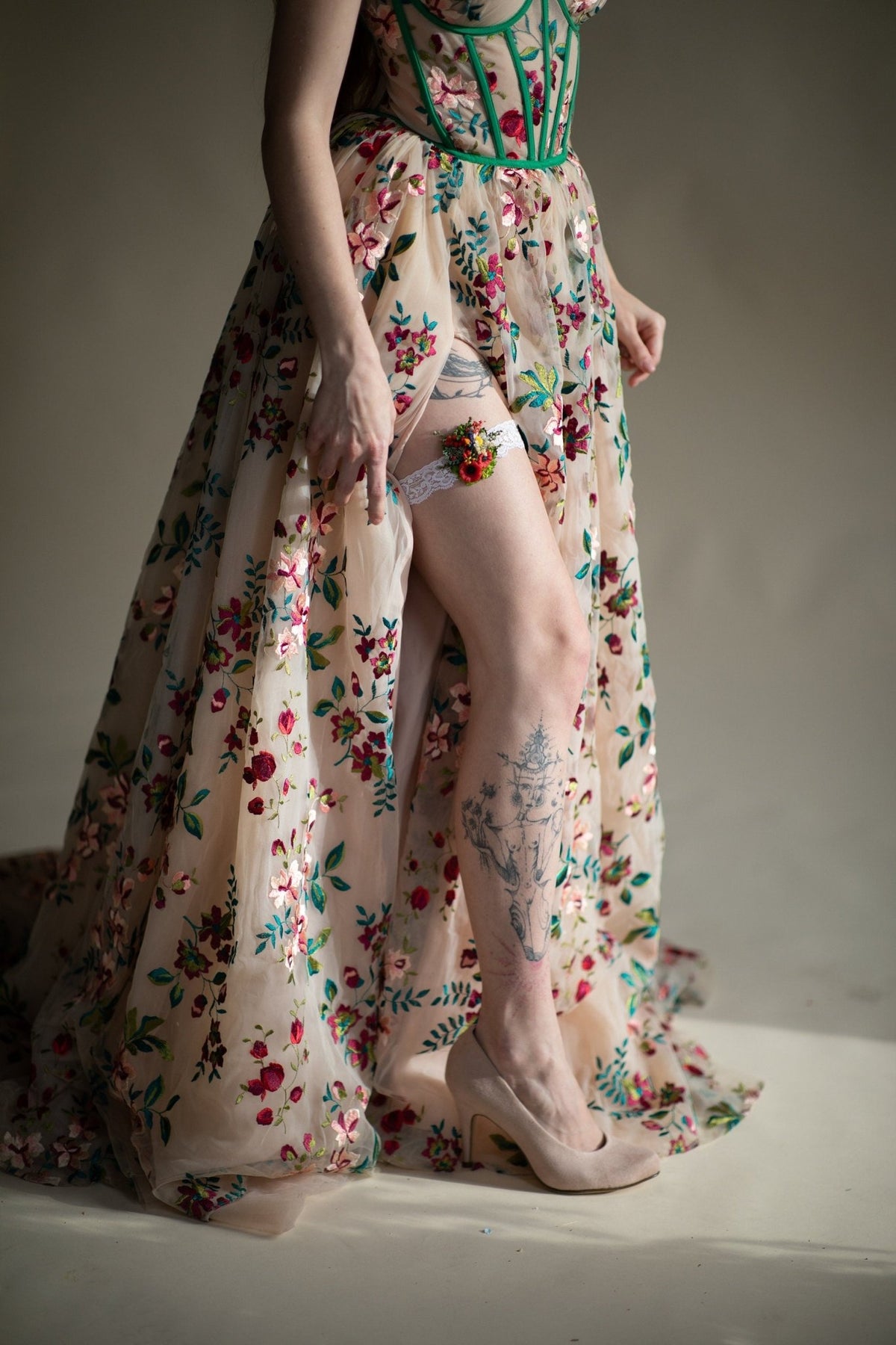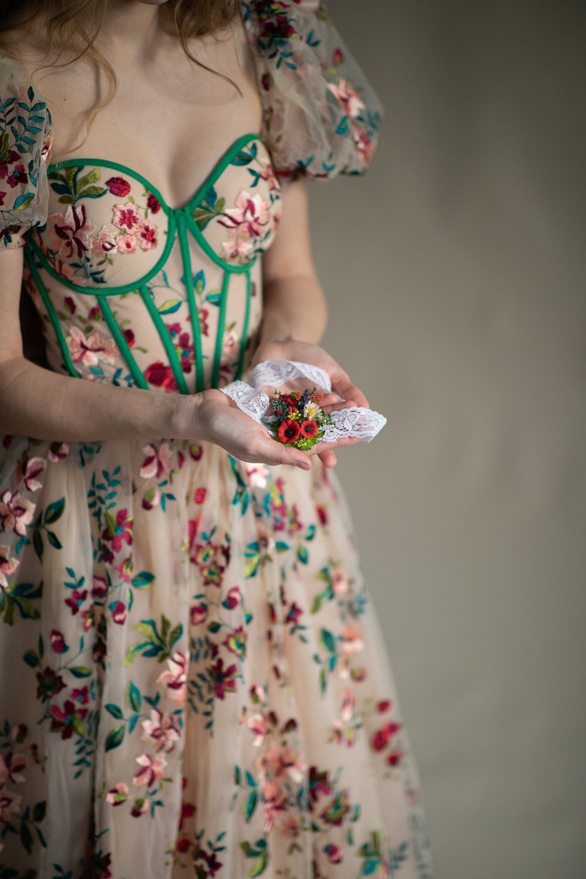 The garter is made of preserved and artificial flowers, lace and other trinkets used for arranging :)