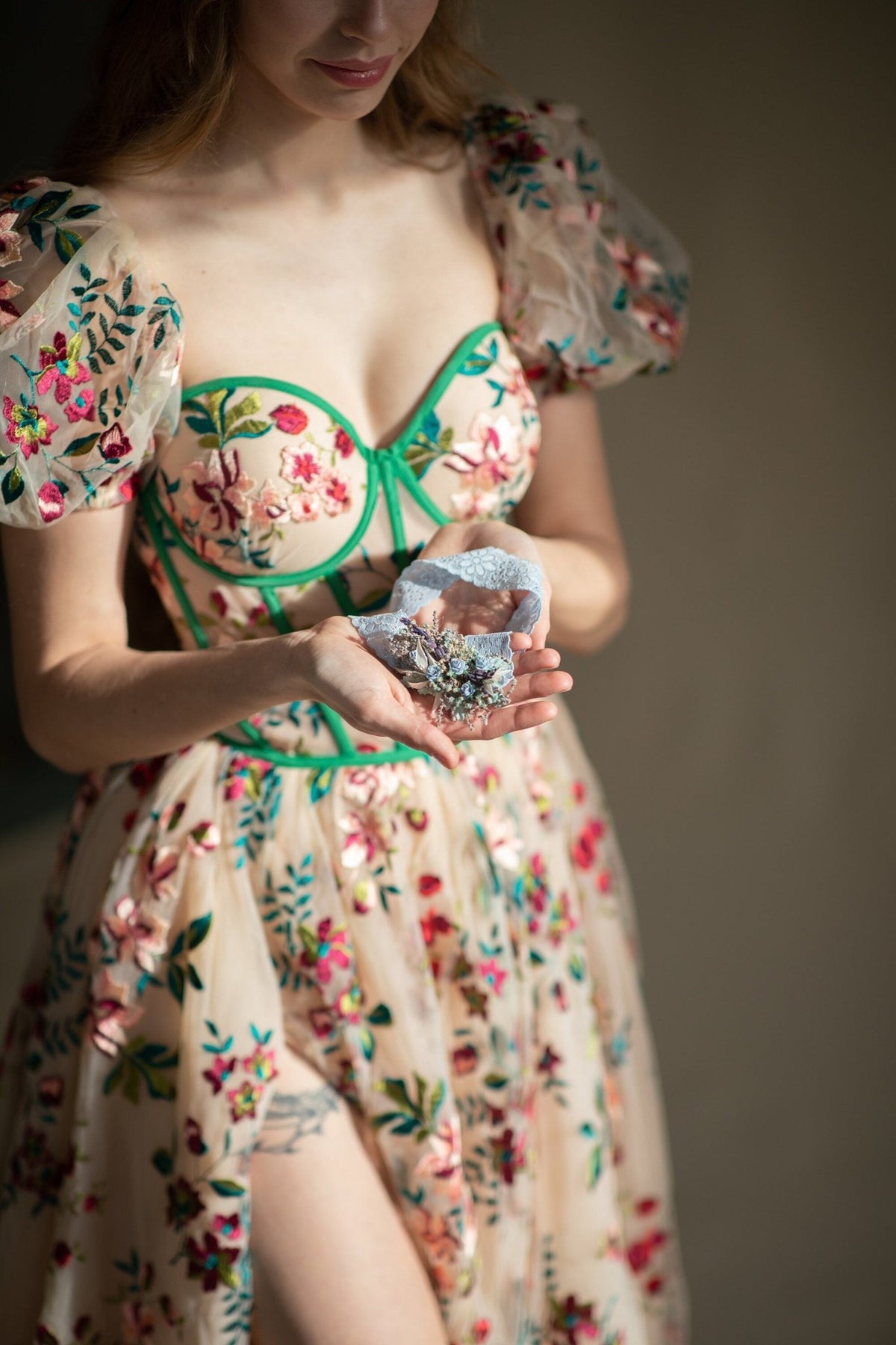 The garter is made of preserved and artificial flowers, lace and other trinkets used for arranging :)