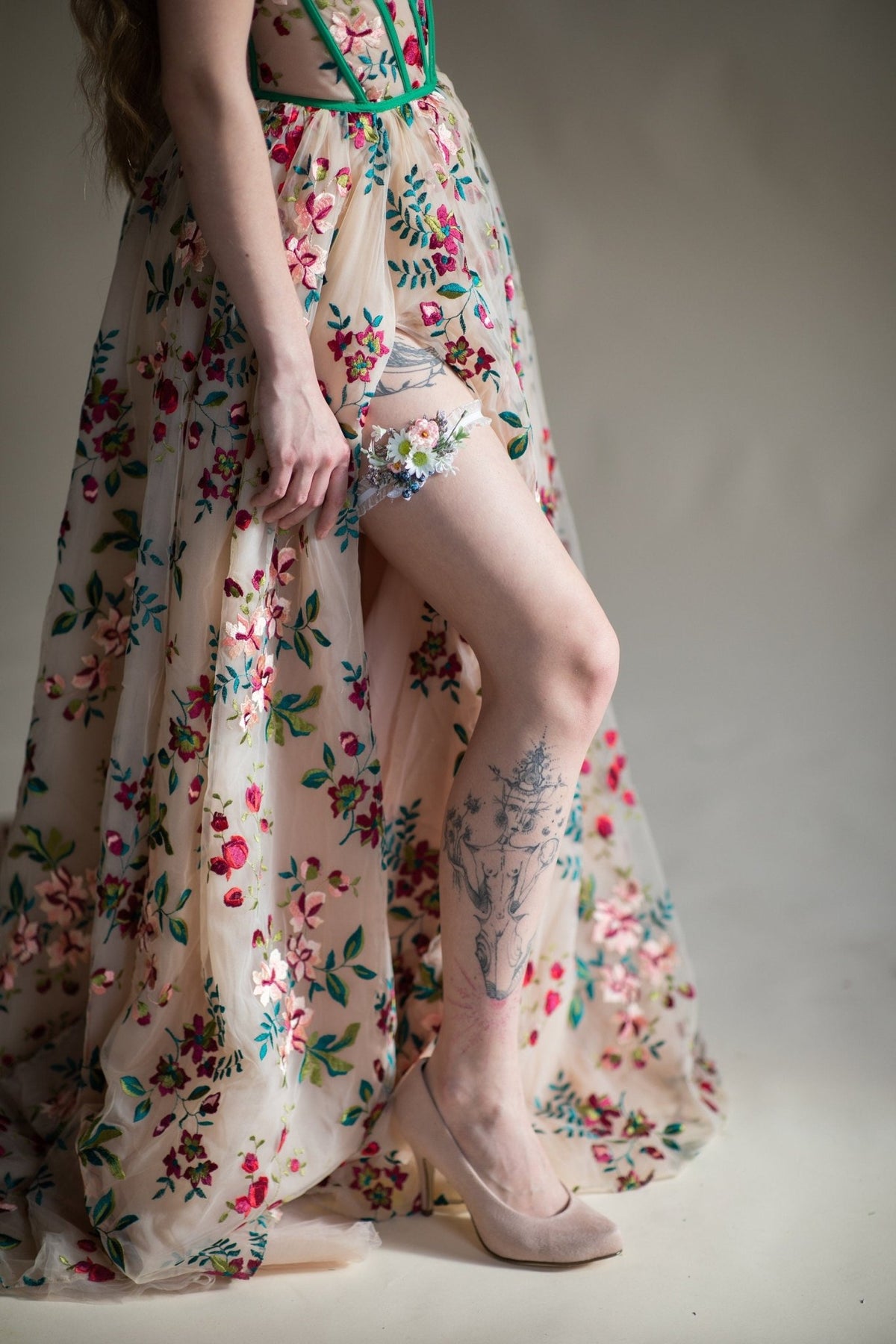 The garter is made of preserved and artificial flowers, lace and other trinkets used for arranging :)