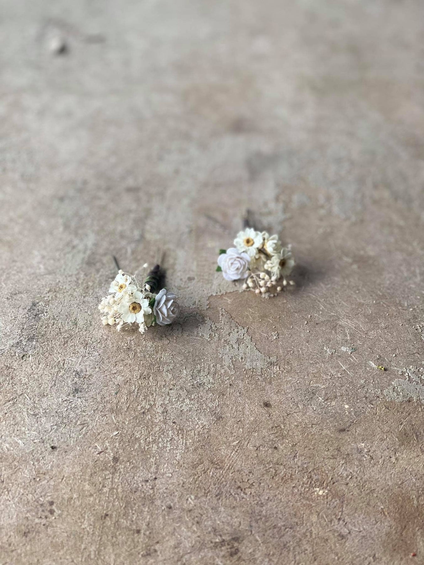 The flower hair comb and hairpins are made of paper flowers, preserved grass, wire and other trinkets used for arranging :)