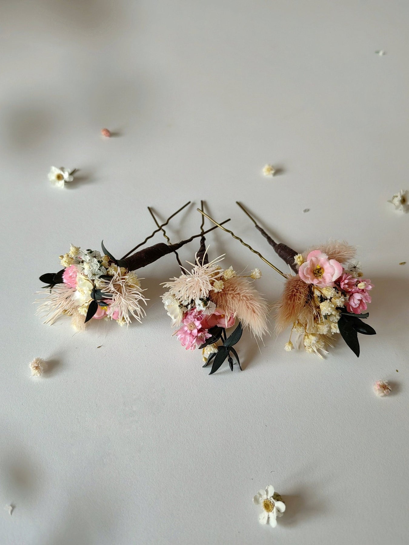 The flower hairpins are made of artificial flowers, preserved flowers, leaves, grass, floristic tape and other trinkets used for arranging.