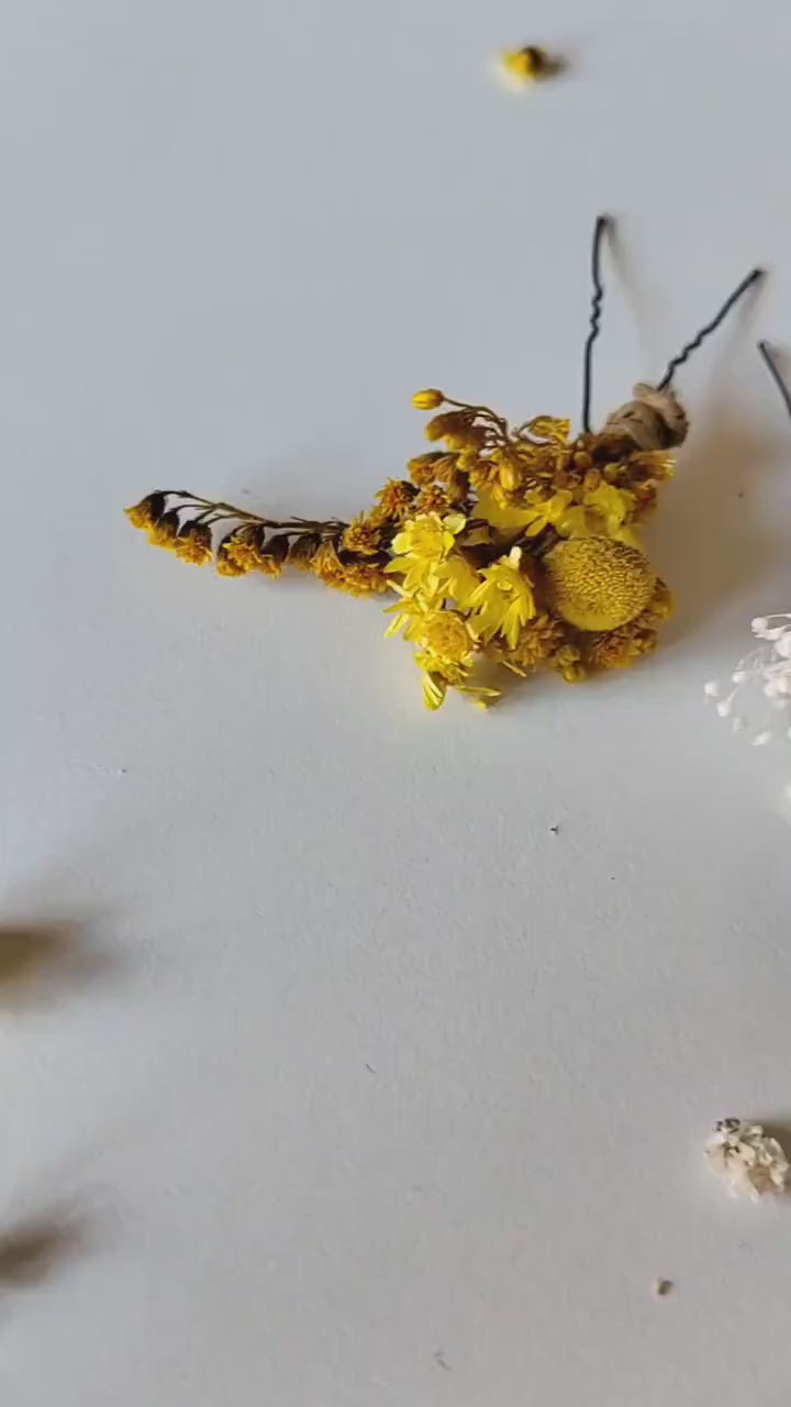 The hairpins are made of preserved flowers, grass, and other trinkets used for arranging.