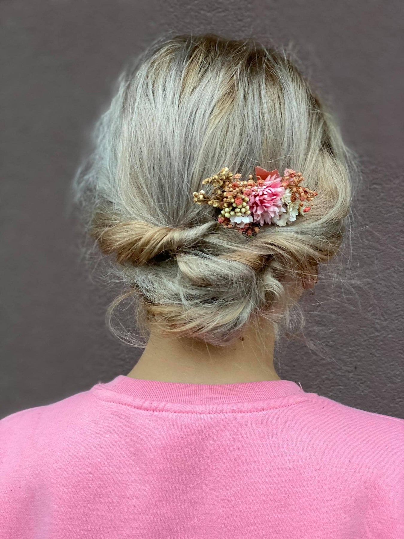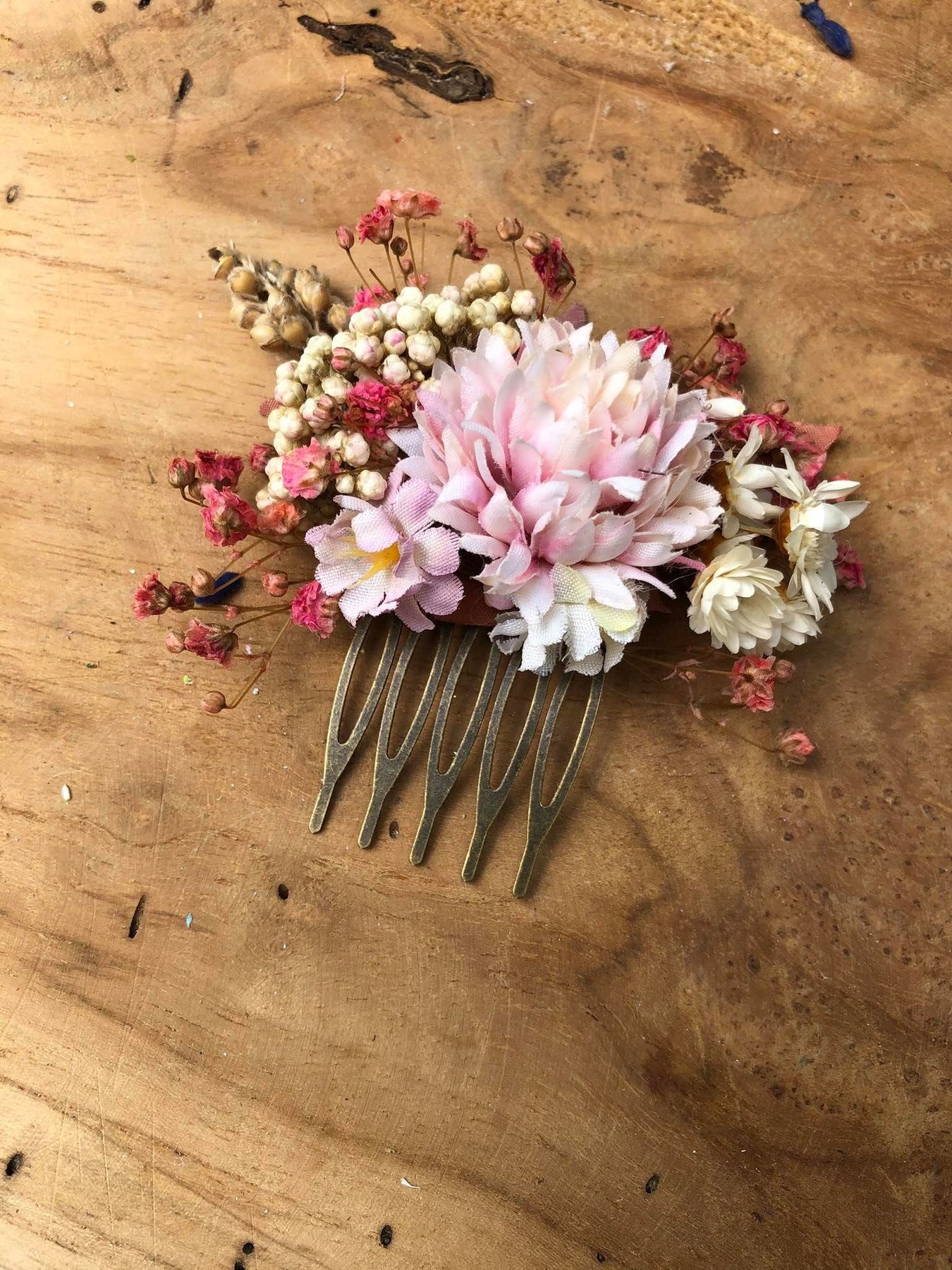 Handmade wedding hair comb is made of artificial/textile flowers, preserved leaves, grass and other trinkets used for arranging :)