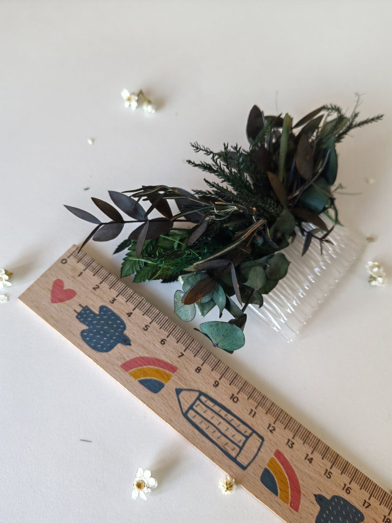 The flower comb is made of preserved flowers, leaves, grass, wire and other trinkets used for arranging :)