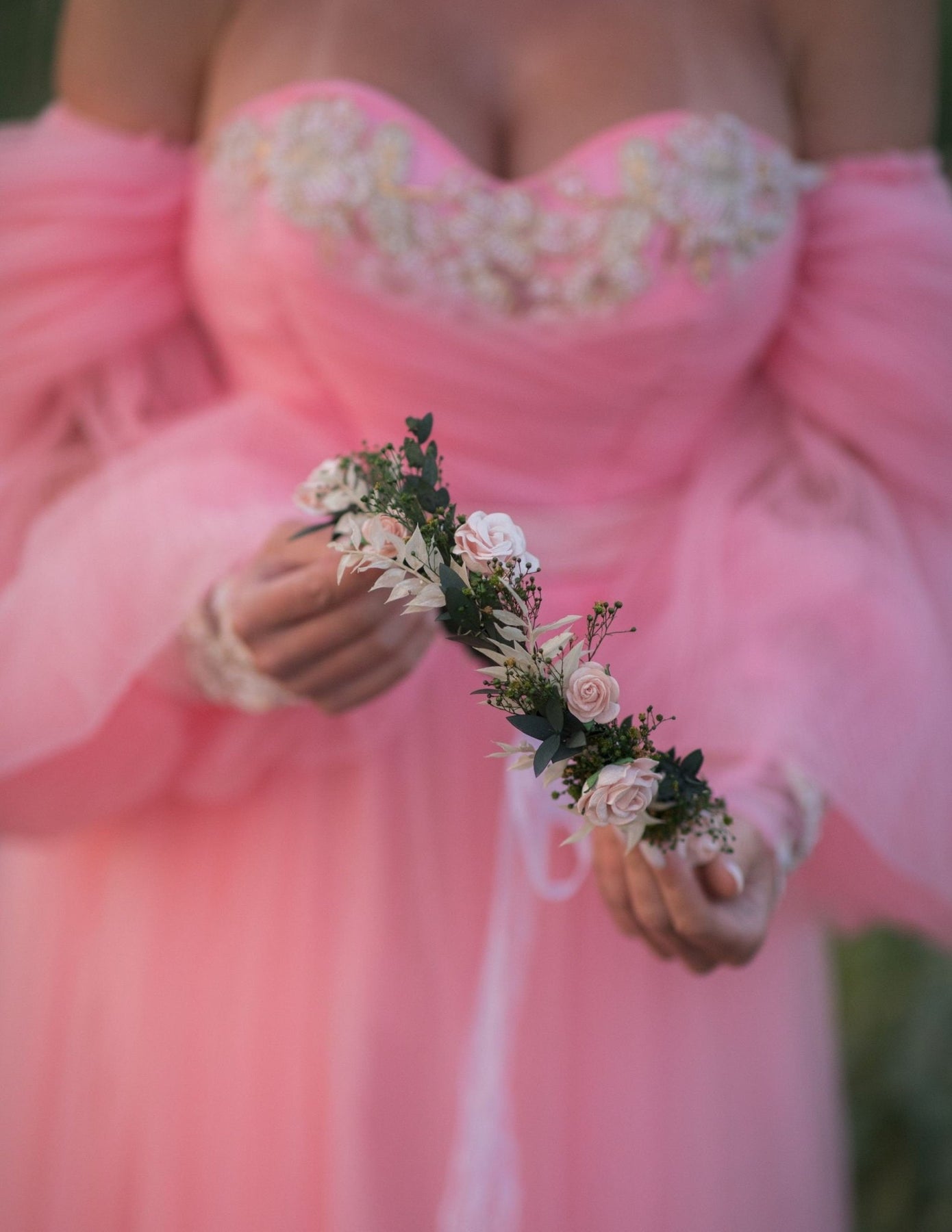 The flower hair wreath is made of preserved leaves, grass, artificial flowers and floristic tape, ribbon...