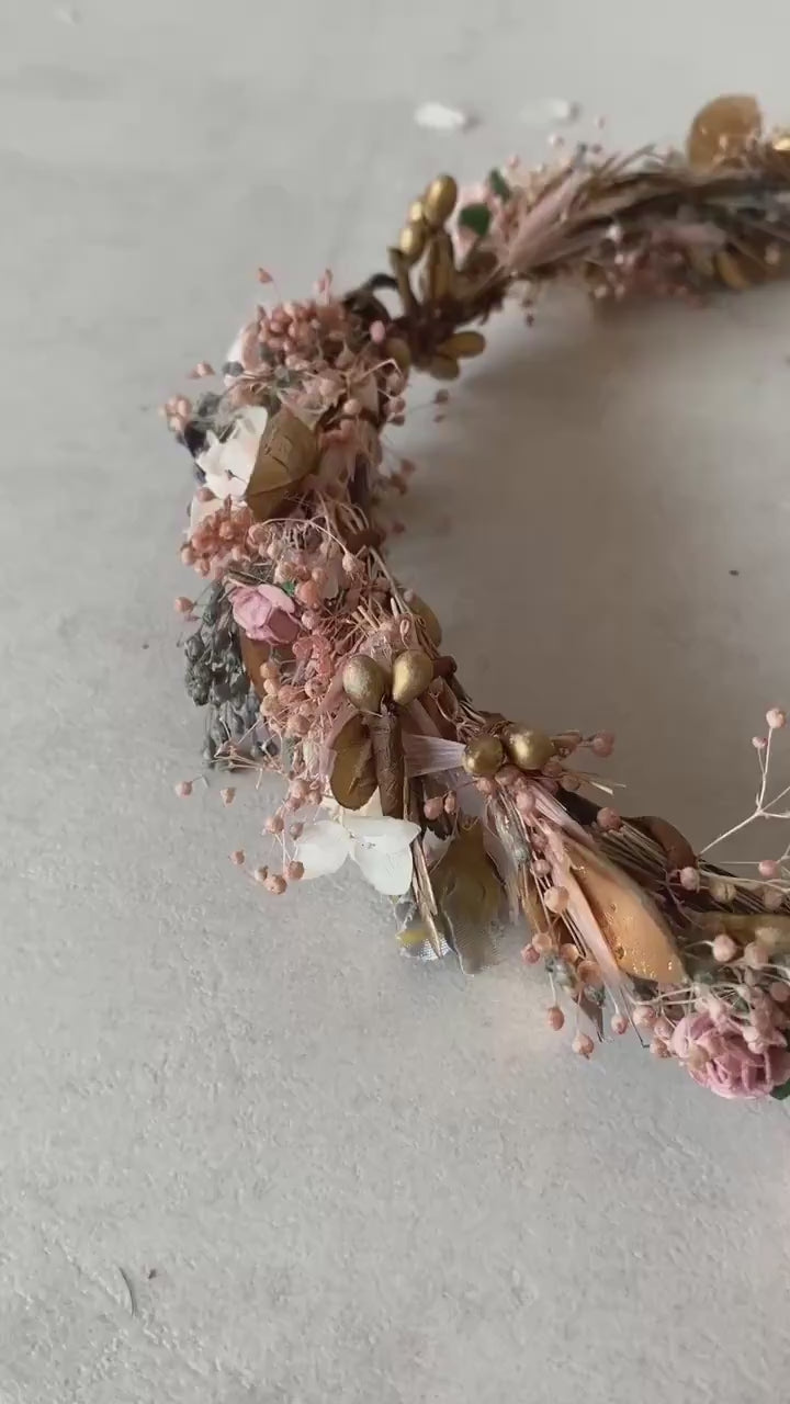 The wreath is made of artificial leaves and flowers, preserved material, wire and other trinkets intended for arranging. Suitable for weddings or everyday use :)