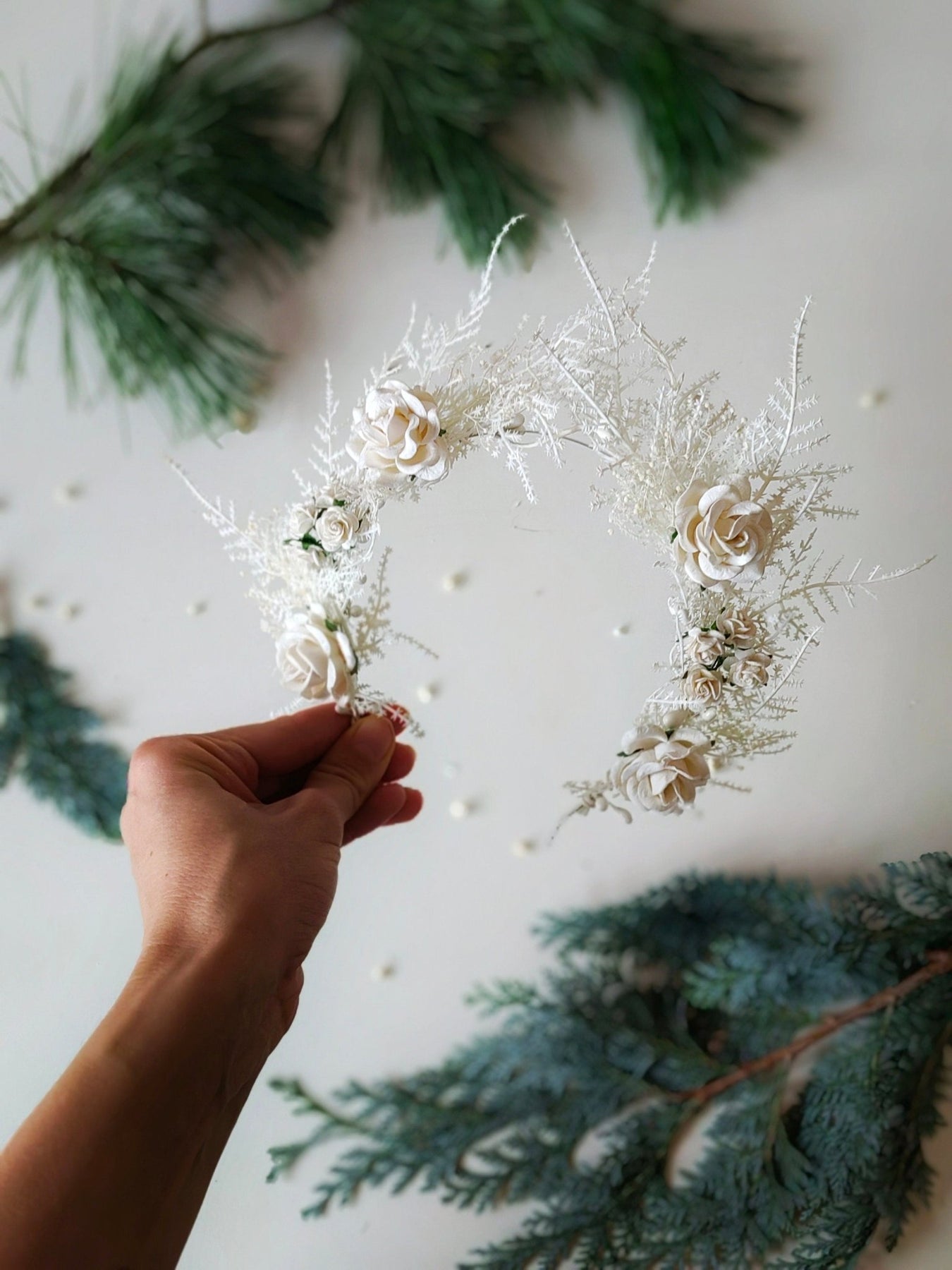 Winter flower crown with soft cream flowers. Suitabe for wedding or for proms and other special events.