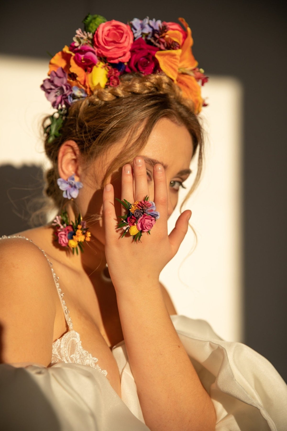 Magnificent, beautiful, full of color and life - this is this Frida headband, which is full of color and flowers. It is a celebration of life and the woman herself. The central flower is a lily. The headband is suitable for a garden wedding, Halloween or a summer festival.
