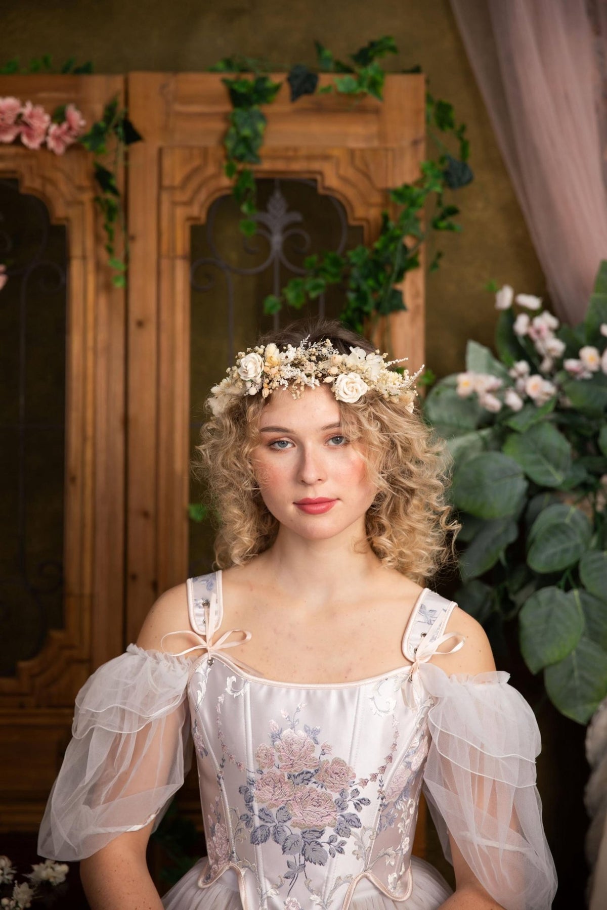 The model is wearing: 1x hair crown, 9x hairpins, 10x single flower hair clips