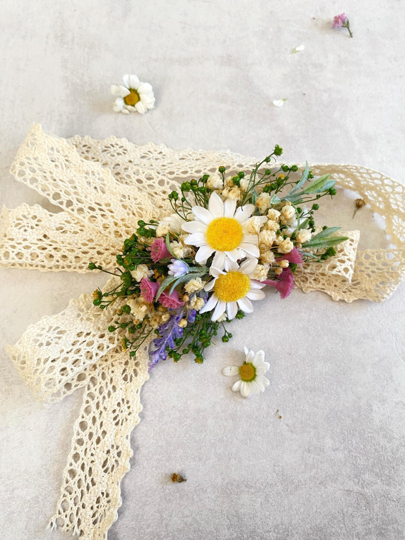 This one is in size S and is made of textile flowers, artificial and preserved materials. The base is a buckle - you can apply it to lace, ribbon, or your own collar (we can adjust the size according to your dog's collar)