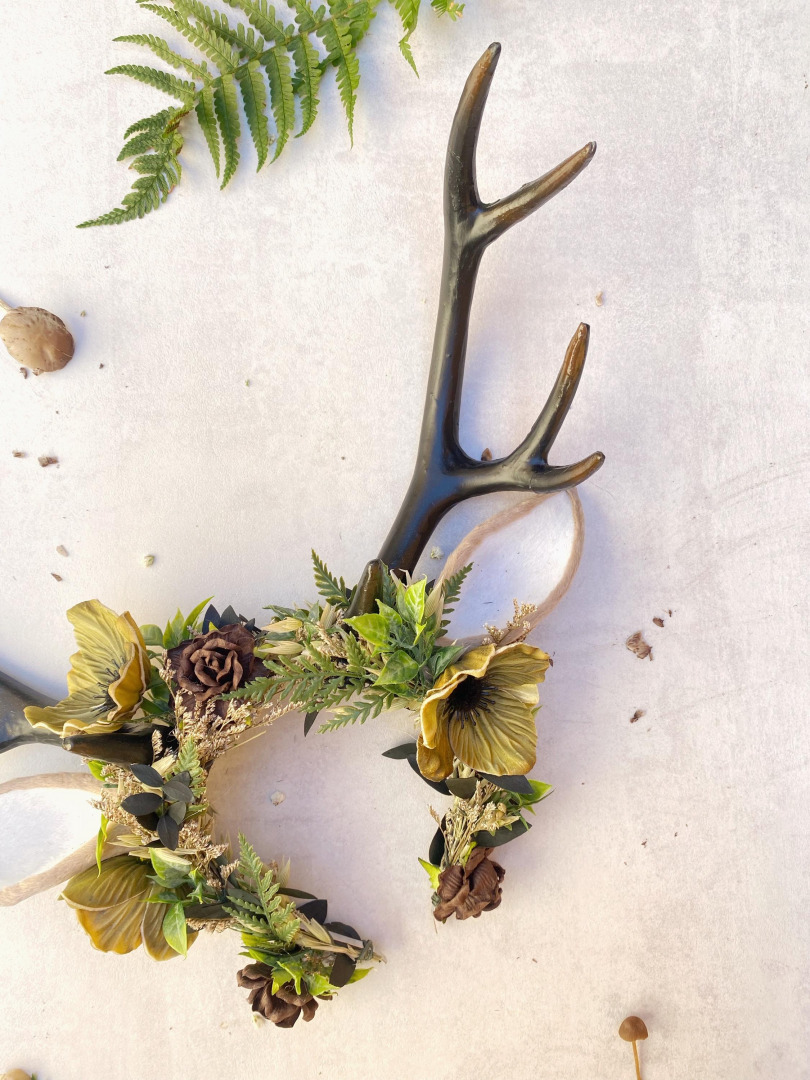 This unique deer antler flower crown combines natural elegance with a touch of fantasy – perfect for pagan festivals, woodland weddings, wicca rituals, cosplay events, Halloween costumes, or magical photoshoots.