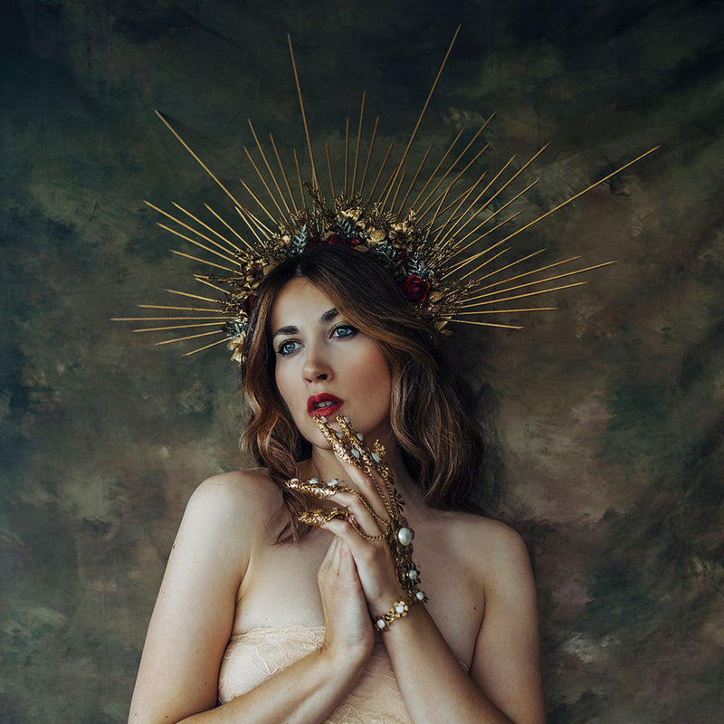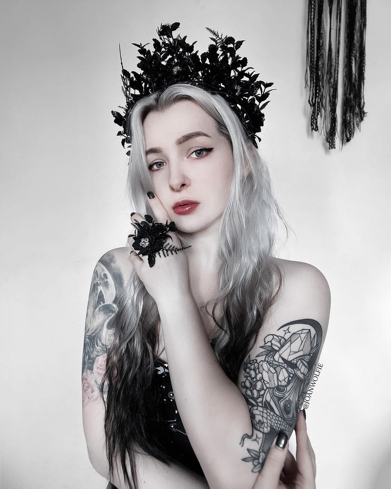 Ritual beauty, pagan symbolism, gothic moods, and dark fantasy worlds where floral accessories become talismans and symbols.