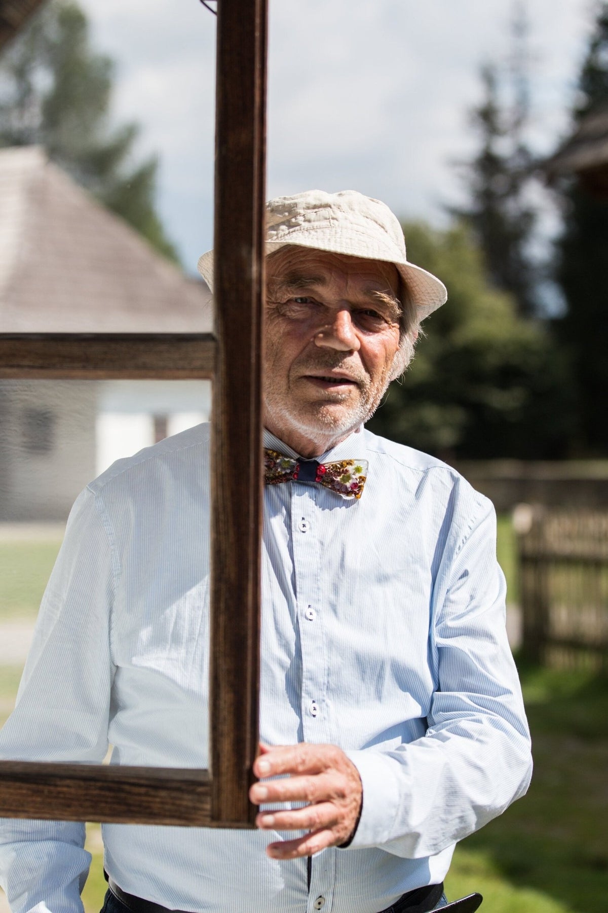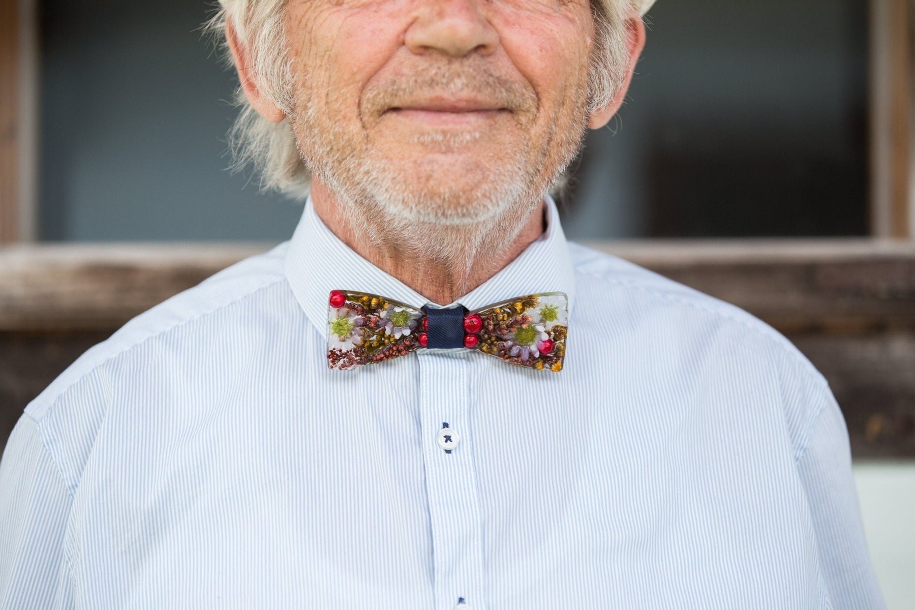 wood and resin bow ties, blending natural wood grain with floral compositions