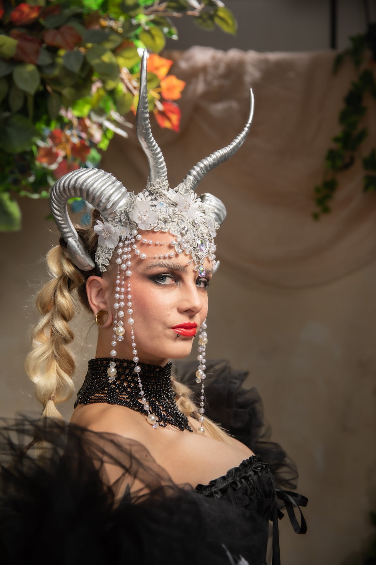 Step into the world of magical balls with our new collection of glamour antler headbands. They are designed for fantasy balls and photoshoots. This is a unique accessory, with every detail handcrafted. This crown is made for a true Ice Queen. ItΒ΄sΒ the ideal choice for a winter fantasy ball or a winter wedding in a fantasy style. It intertwines exclusive lace, premium artificial flowers with beads, rhinestones, and pearls - simply an accessory that will make you unforgettable and make you feel like never before.