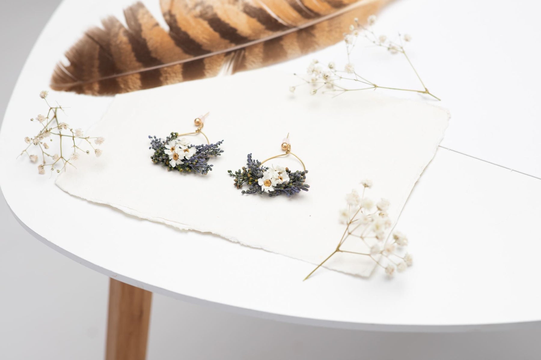 The earrings are made of preserved flowers, leaves and grass, wire, and other trinkets used for arranging :)
