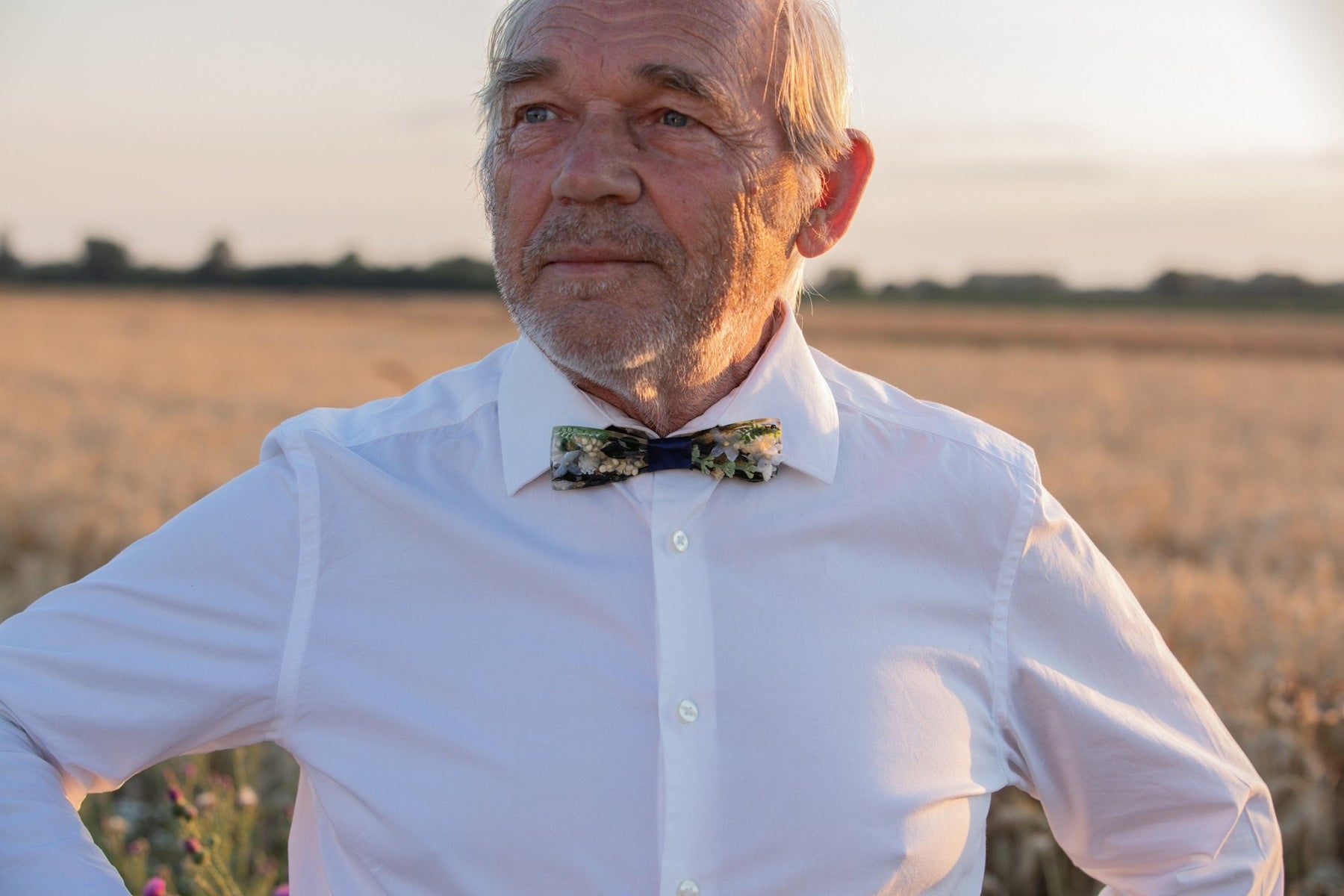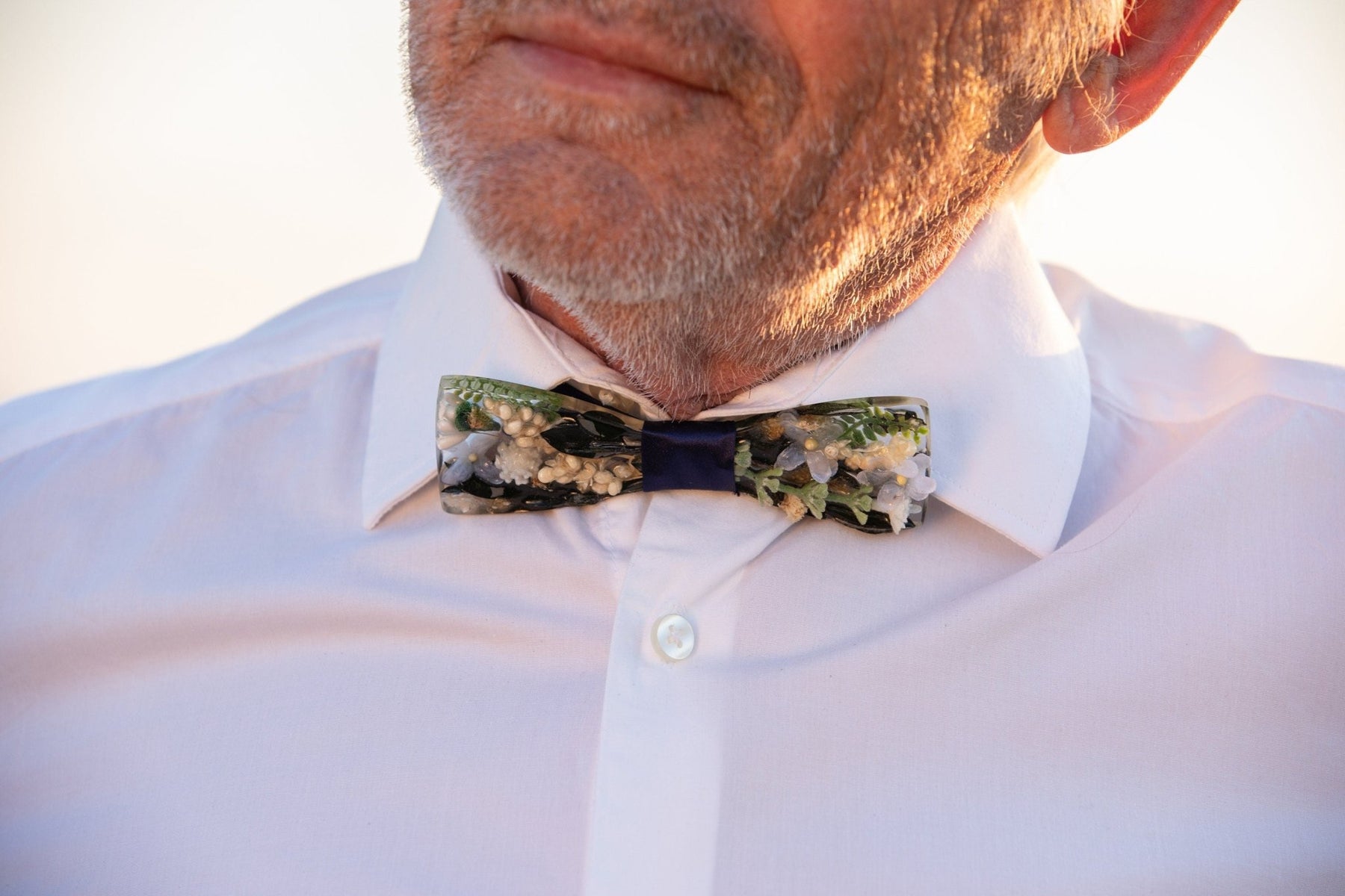 Motýlik z námorníckej modrej živice s kvetinovým vzorom: Drevená svadobná kravata