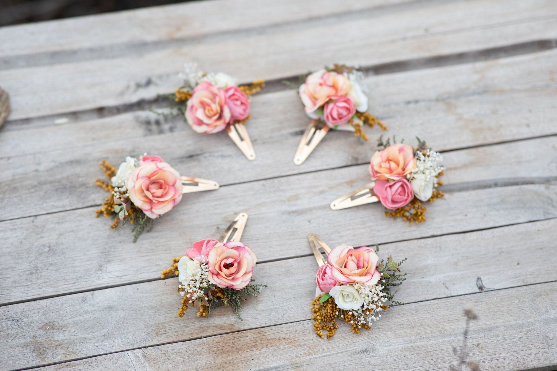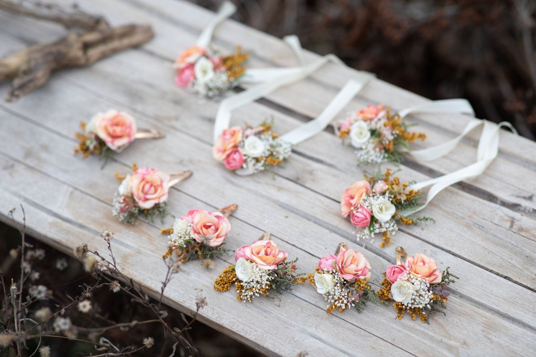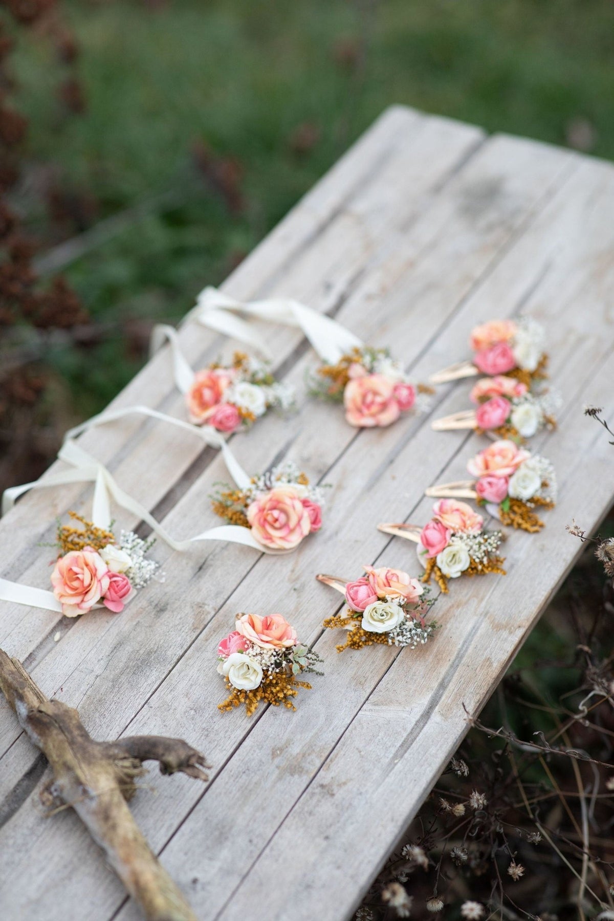 Kvetinové sponky do vlasov sú vyrobené z konzervovaných a umelých kvetov, trávy, listov, stužiek a iného aranžovacieho materiálu.