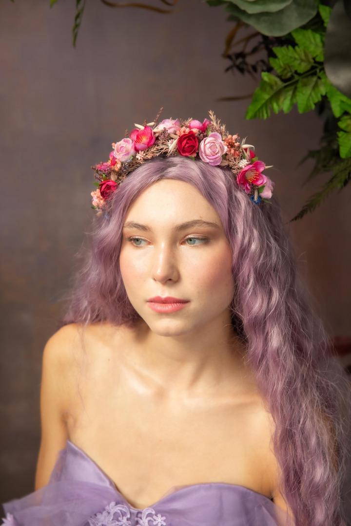 Klasická kvetinová čelenka na špeciálne príležitosti aj bežný deň,zdobená po celom obvode. Mäkký ohybný základ,netlačí ani pri ouliaroch. Univerzálna,vhodná už pre deti od dvoch rokov.