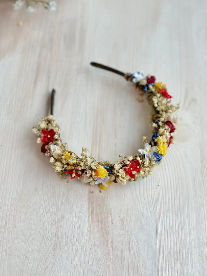 Klasická kvetinová čelenka na špeciálne príležitosti aj bežný deň,zdobená po celom obvode. Mäkký ohybný základ,netlačí ani pri okuliaroch. Univerzálna,vhodná už pre deti od dvoch rokov.