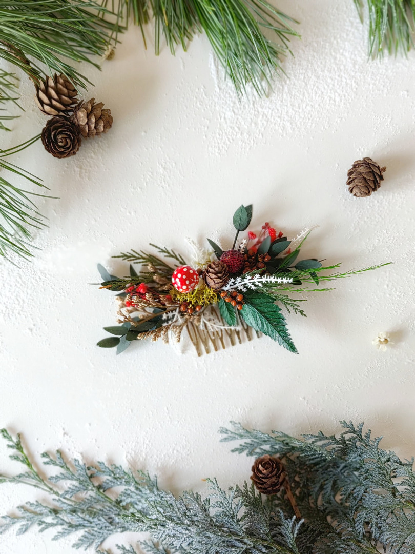 Christmas/winter flower hair comb with toadstool and pine cones in woodland design :)