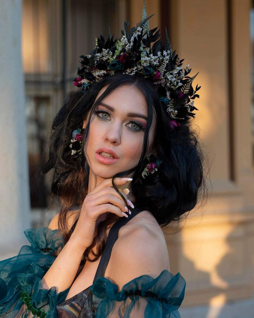 The flower headband and earrings are made of preserved and artificial-fabric flowers, grass and leaves, wire and other arranging material.