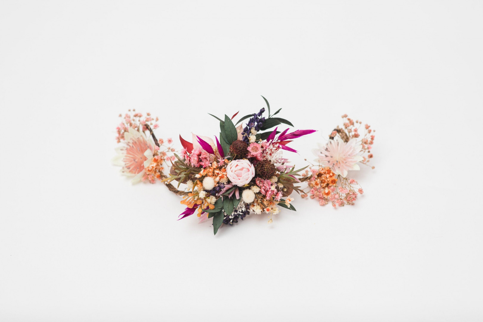 The product is made of artificial flowers, preserved leaves, wire, grass and other trinkets used for arranging :)