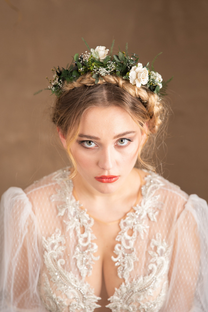 It's made of preserved eucalyptus leaves, baby´s breath, grass, artificial flowers and other material used for arranging. Fragile natural material. It can fall gently. It's not a fault of the product..