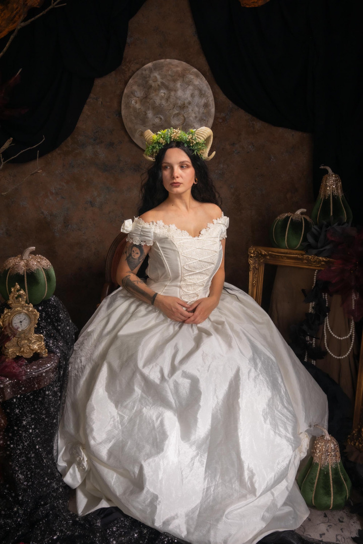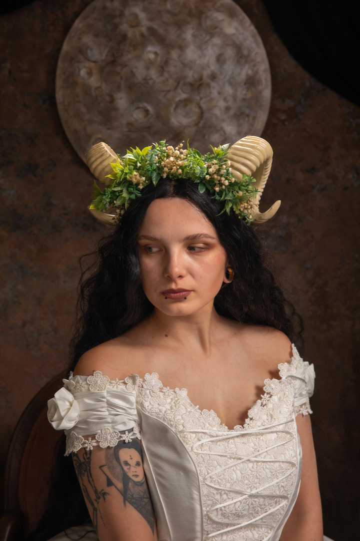 Pagan flower crown in greenery design with hornsThe flower crown is made of artificial materials, horns and other trinkets used for arranging. When stored in dry and dark place, our products last 10-15 years. We can also make you other ...