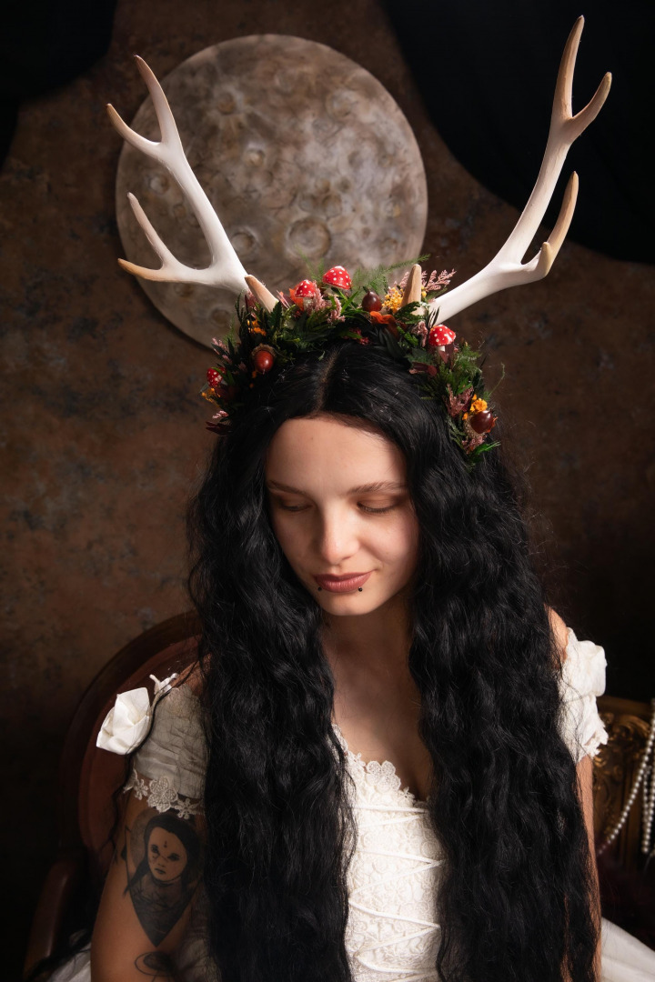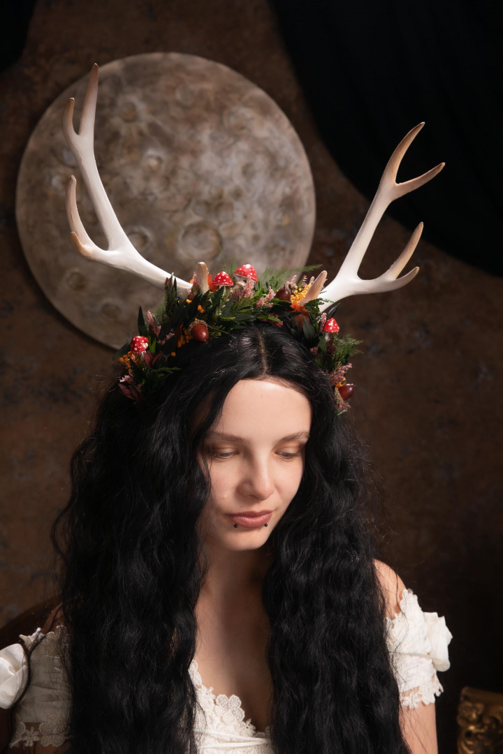 Perfect for PAGAN festival. Flower headband with (not real) antlers/horns The flower headband is made of preserved and artificial flowers, grass, antlers and other arranging material. When stored in dry and dark place, our products last ...